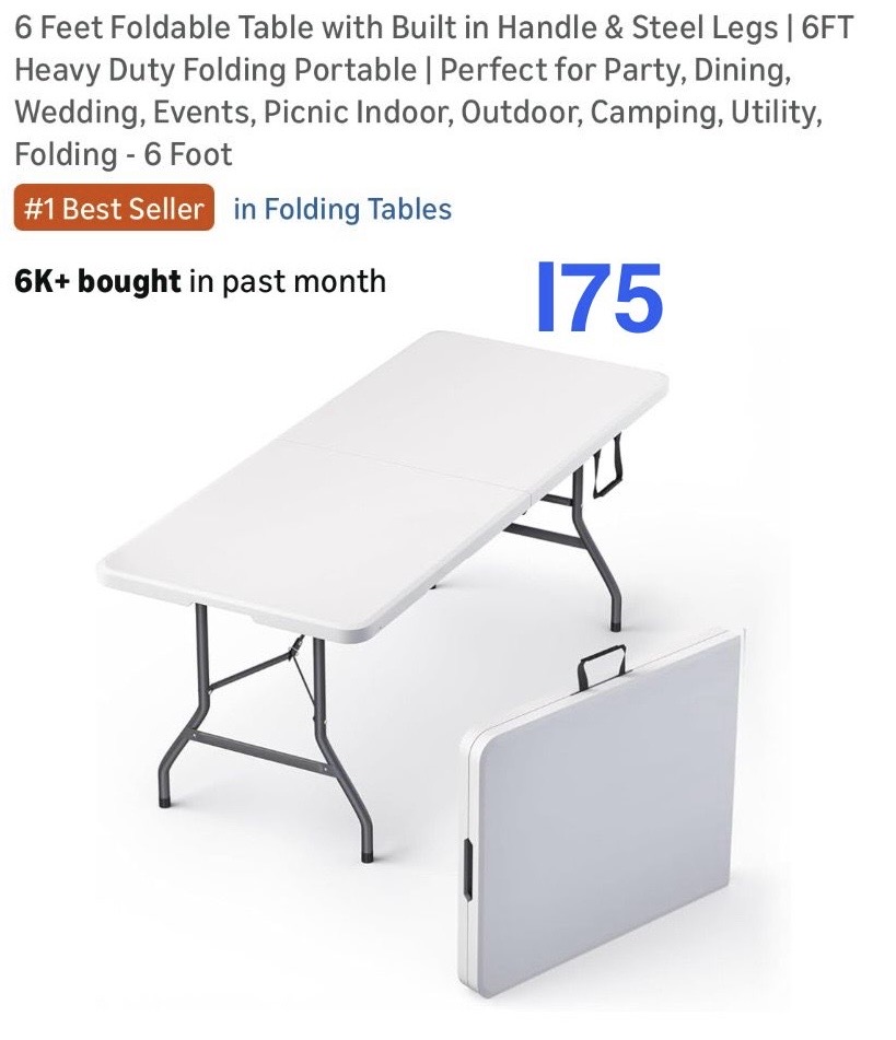 6 Feet Foldable Table with Built in Handle & Steel Legs #I75