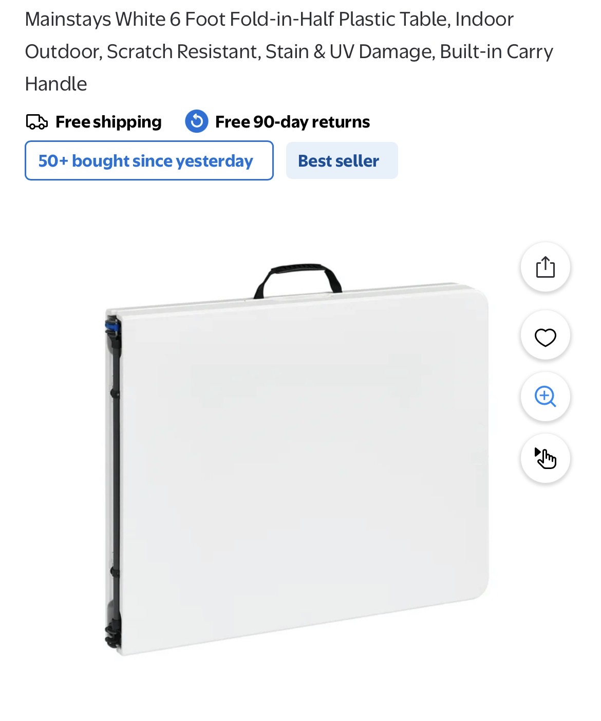Mainstays White 6 Foot Fold-in-Half Plastic Table #D25