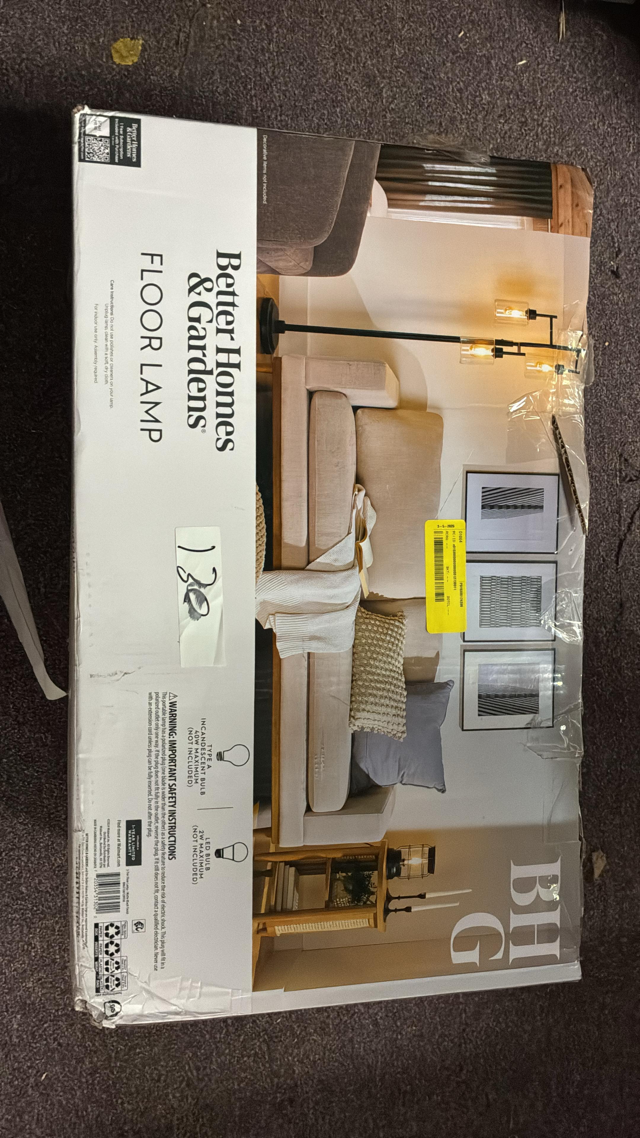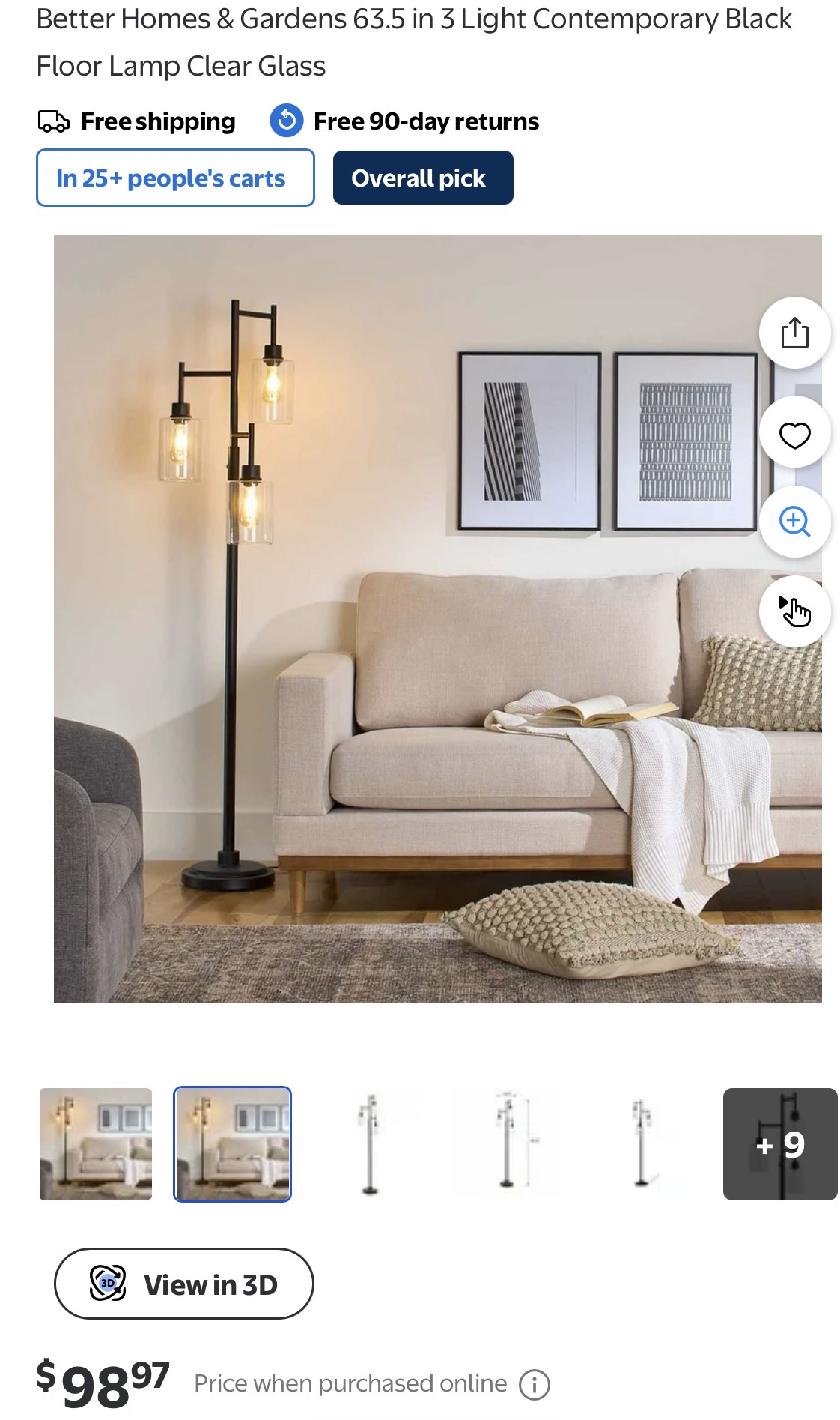 Better Homes & Gardens 63.5 in 3 Light Contemporary Black Floor Lamp Clear Glass #D130