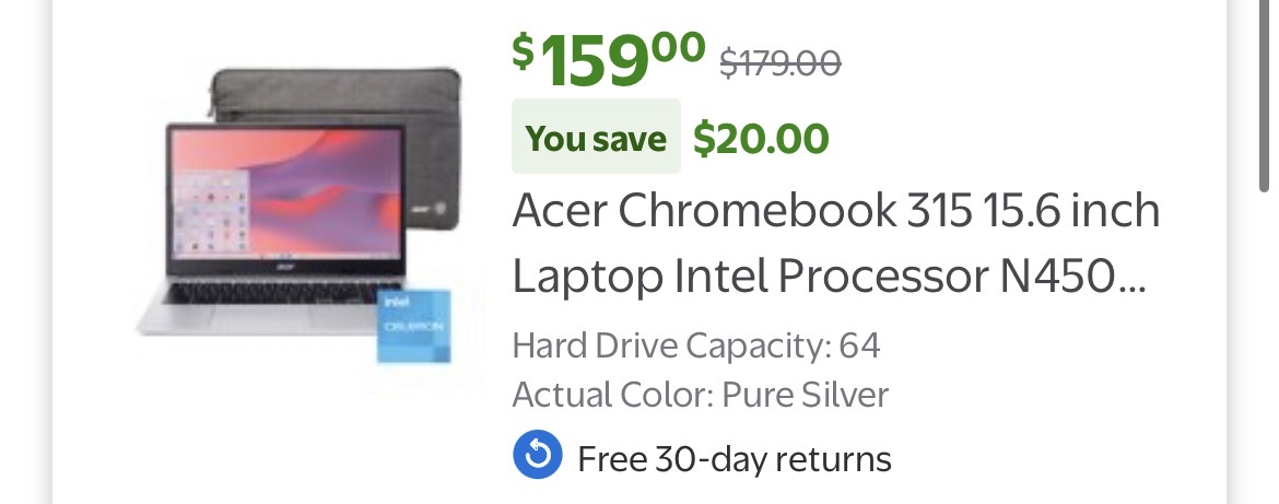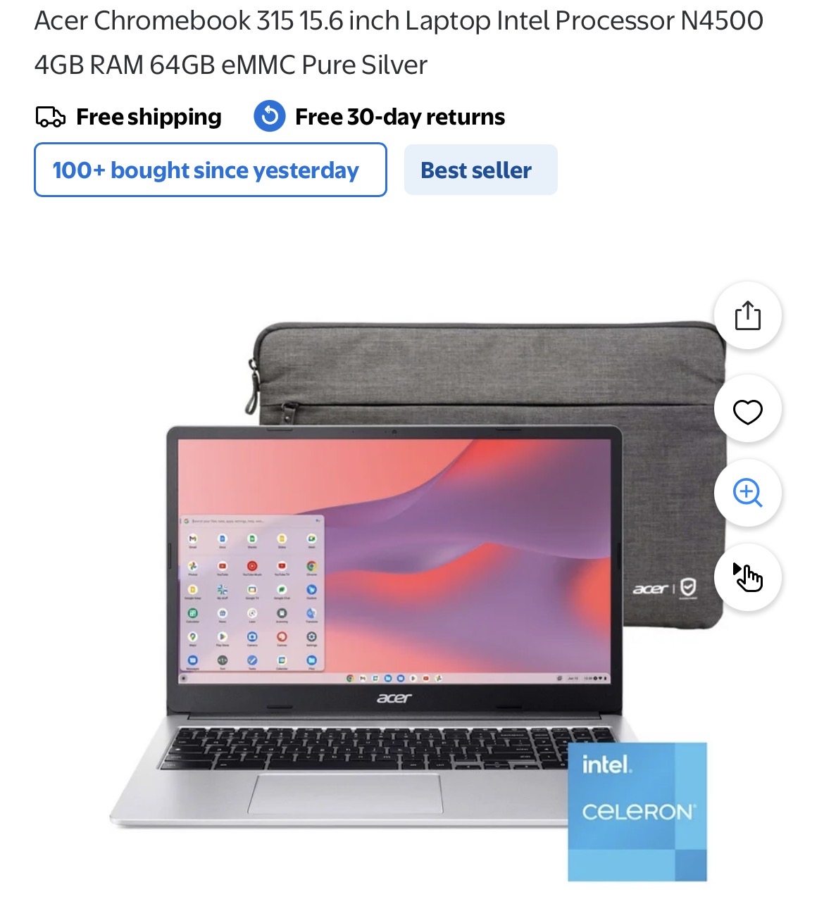 Acer Chromebook 315 15.6 inch Laptop Intel Processor N4500 4GB RAM 64GB eMMC Pure Silver #D135