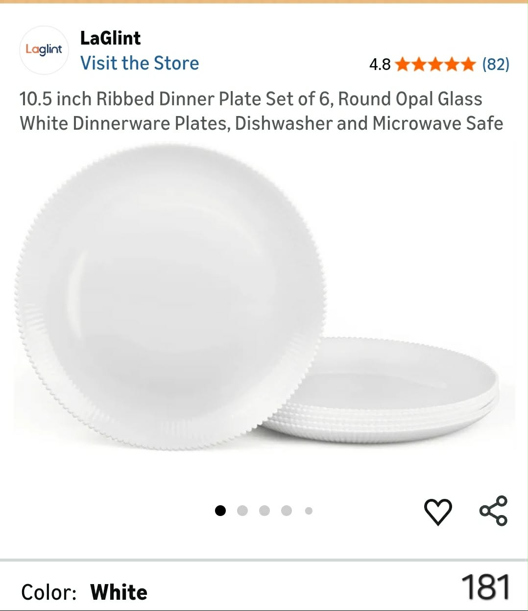 10.5 inch Ribbed Dinner Plate Set of 6, Round Opal Glass White Dinnerware Plates. Lv181