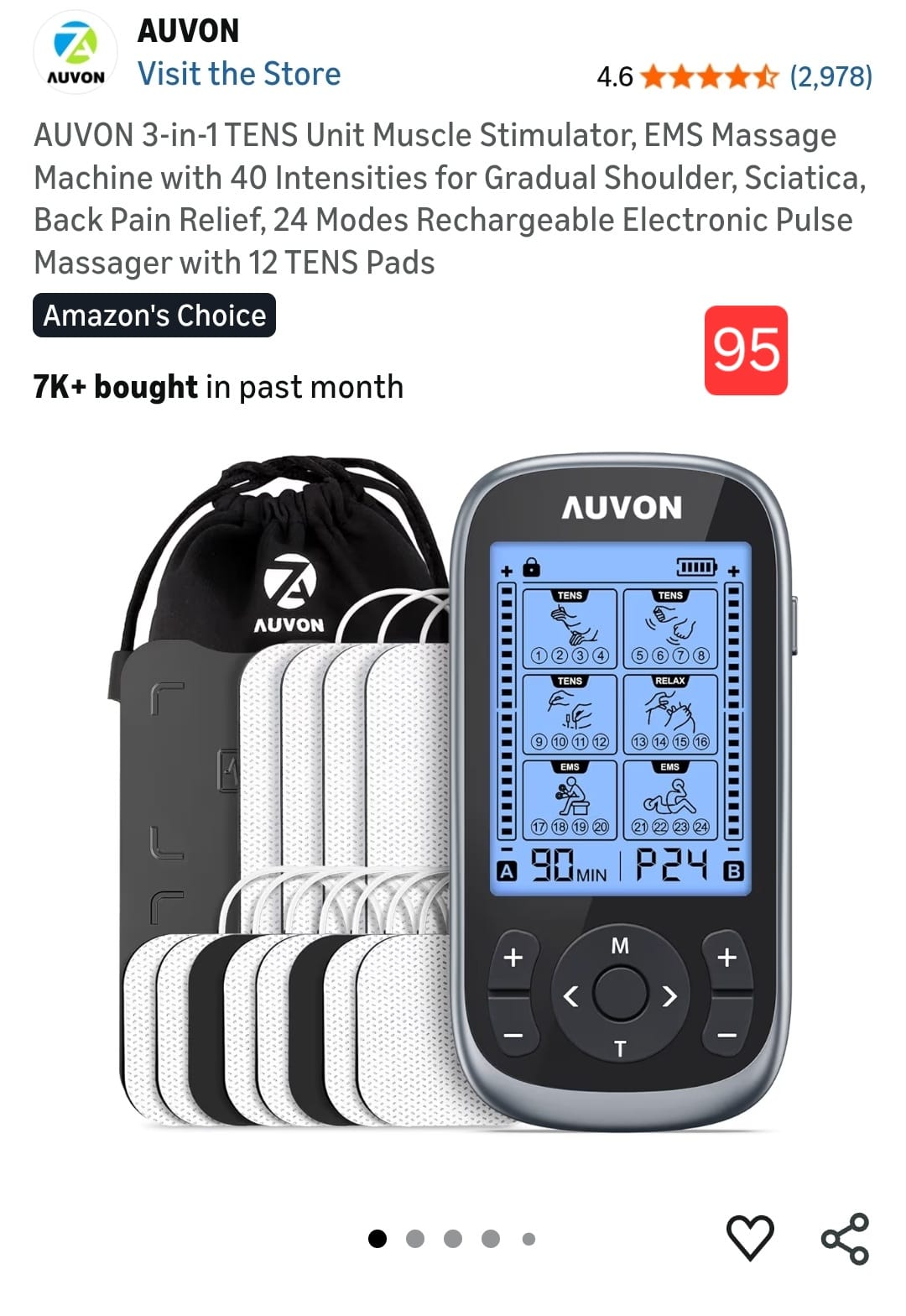 AUVON 3-in-1 TENS Unit Muscle Stimulator, EMS Massage Machine with 40 Intensities for Gradual Shoulder, Sciatica, Back Pain Relief. 95
