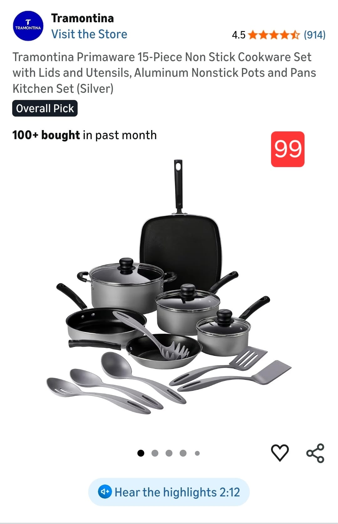 Tramontina Primaware 15-Piece Non Stick Cookware Set with Lids and Utensils, Aluminum Nonstick Pots and Pans Kitchen Set (Silver). 99