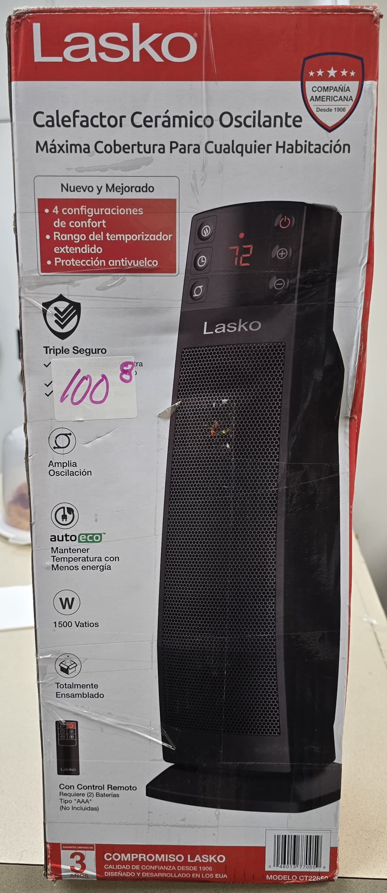 Lasko 22" Oscillating Ceramic Tower Space Heater, Auto Dimming Display, Tip-Switch, Remote, CT22850. 100