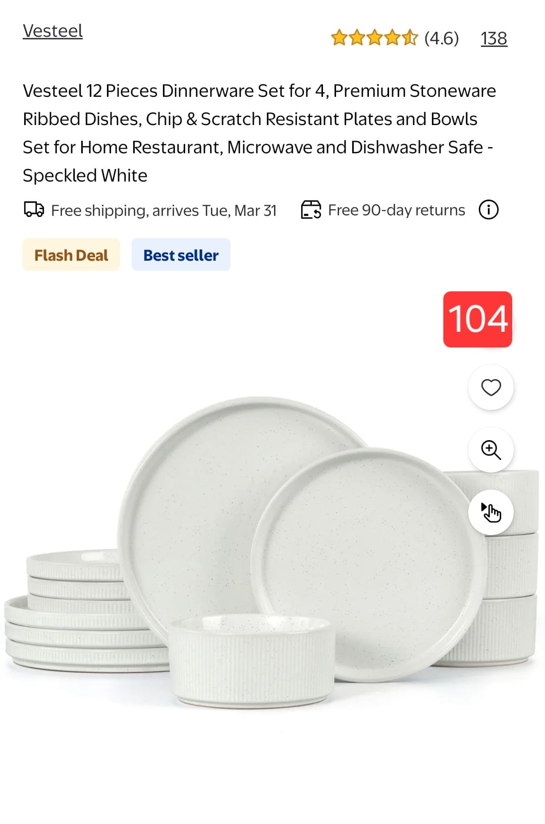 Vesteel 12 Pieces Dinnerware Set for 4, Premium Stoneware Ribbed Dishes, Chip & Scratch Resistant Plates and Bowls Set for Home Restaurant, Microwave and Dishwasher Safe -Speckled White. 104