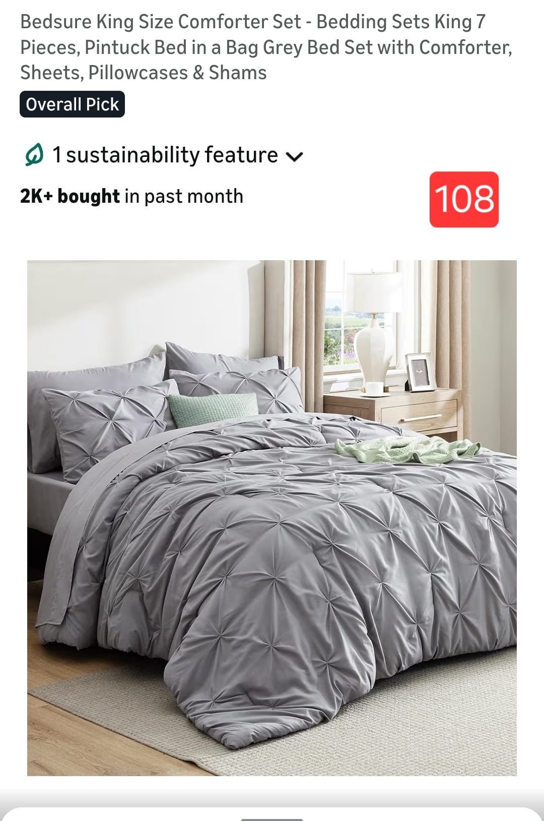 Bedsure King Size Comforter Set - Bedding Sets King 7 Pieces, Pintuck Bed in a Bag Grey Bed Set with Comforter, Sheets, Pillowcases & Shams. 108