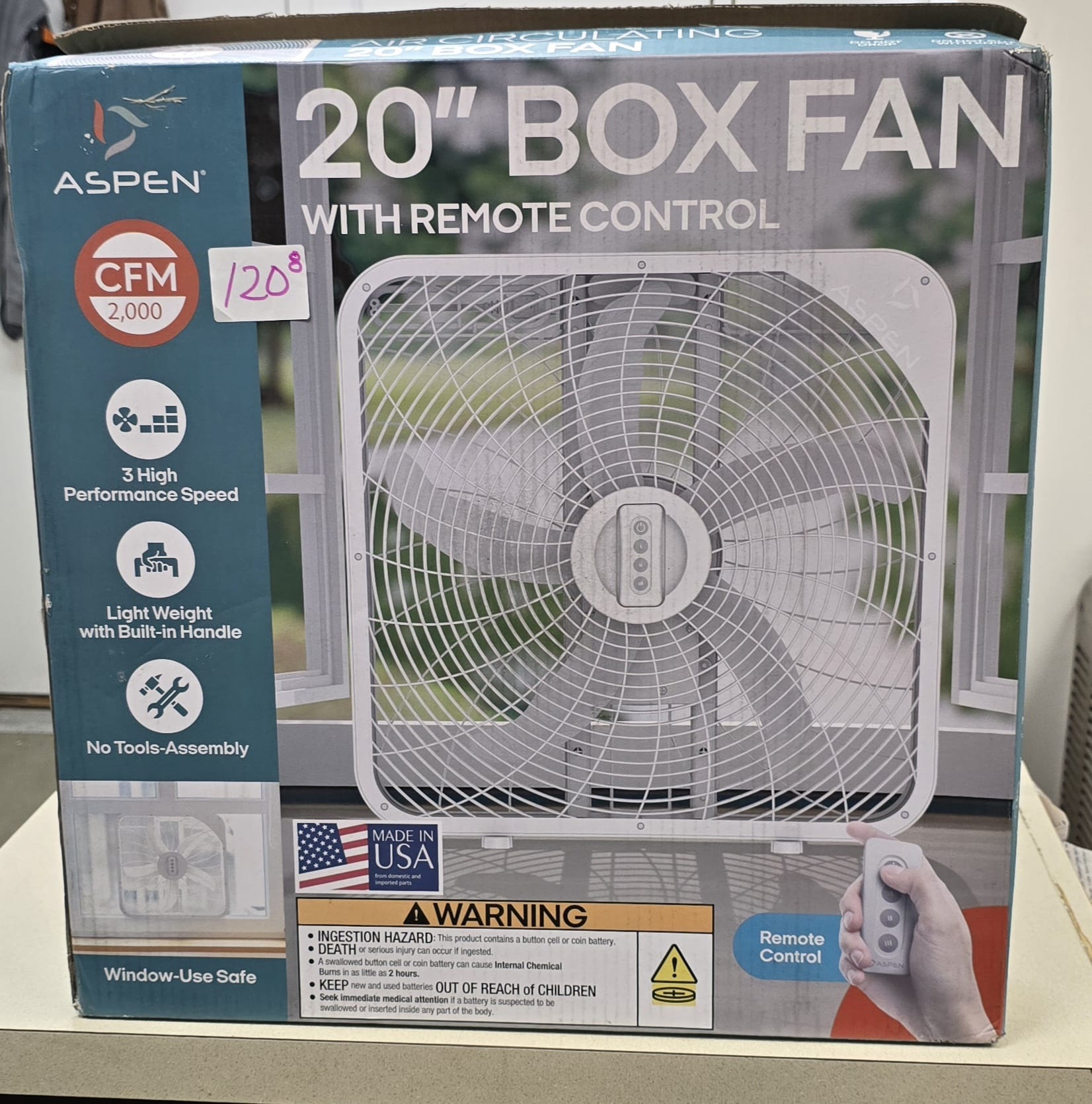 Aspen Box Fan 20 Inch with remote control Small Box Fans, Home Window Box Fans 3 Speed Quiet Most Powerful Window Fans for Home Bedroom Square Fan. 120