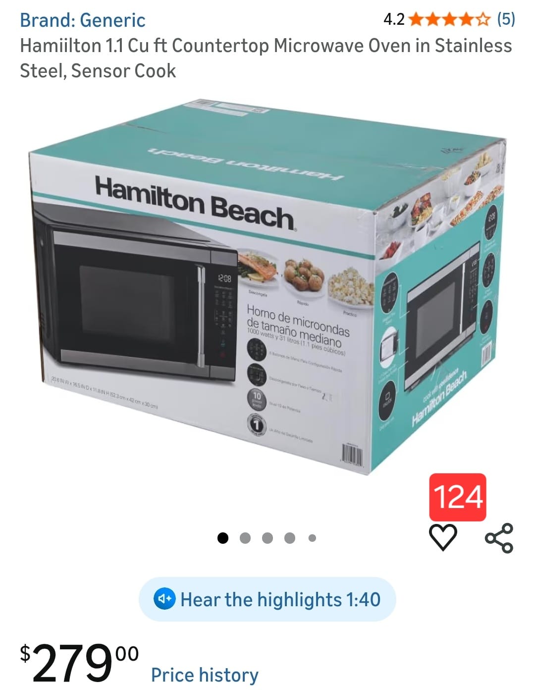 Hamiilton 1.1 Cu ft Countertop Microwave Oven in Stainless Steel, Sensor Cook. 124