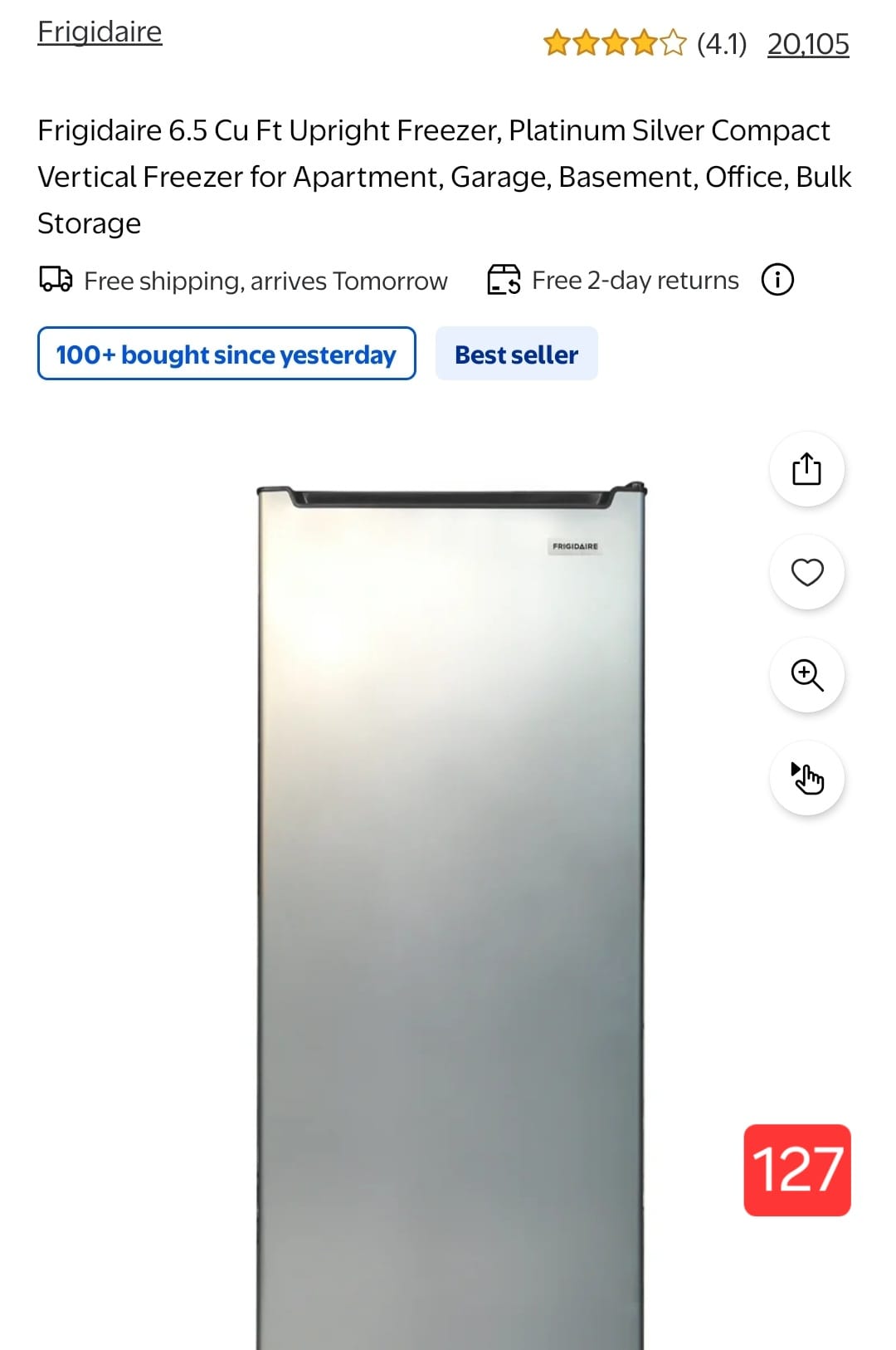 Frigidaire 6.5 Cu Ft Upright Freezer, Platinum Silver Compact Vertical Freezer for Apartment, Garage, Basement, Office, Bulk Storage. 127