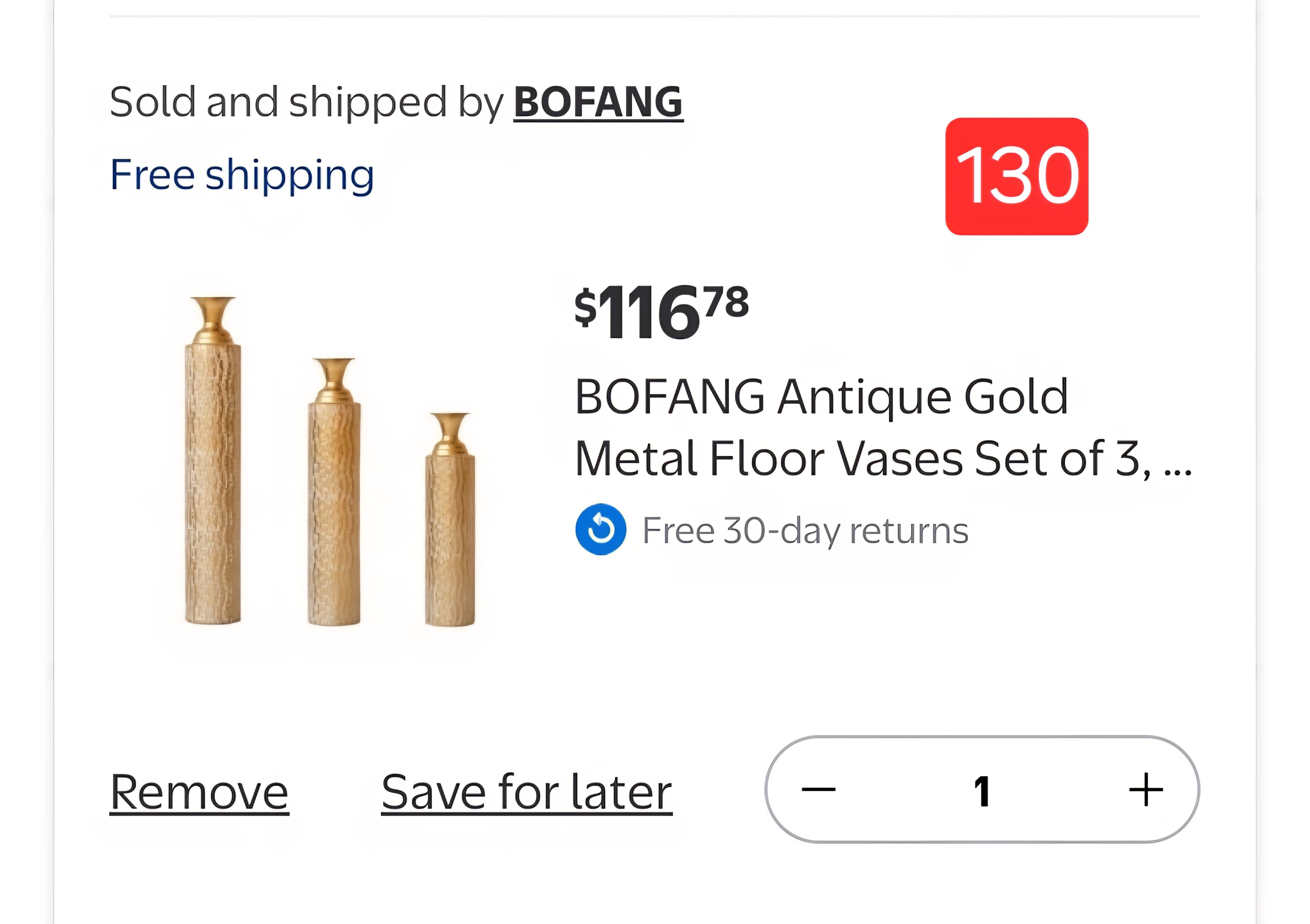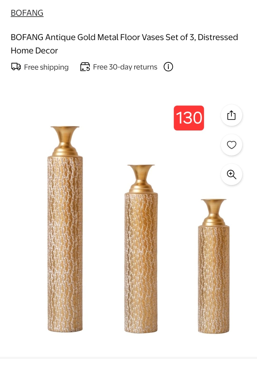 BOFANG Antique Gold Metal Floor Vases Set of 3, Distressed Home Decor. 130