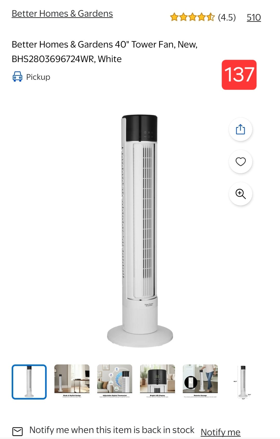 Better Homes & Gardens 40" Tower Fan, New, BHS2803696724WR, White. 137
