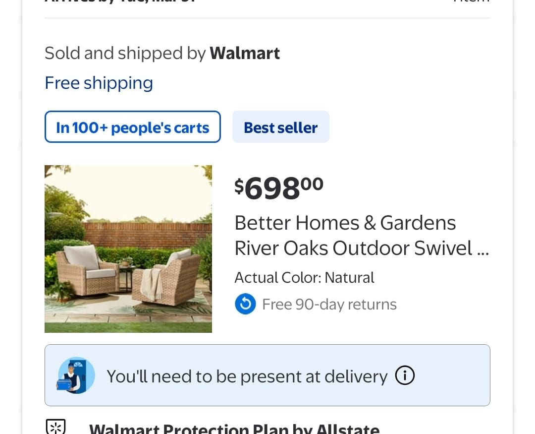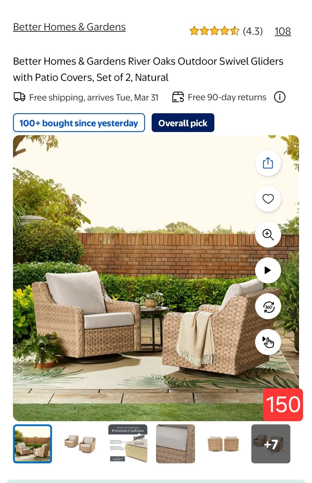 Better Homes & Gardens River Oaks Outdoor Swivel Gliders with Patio Covers, Set of 2, Natural. 150