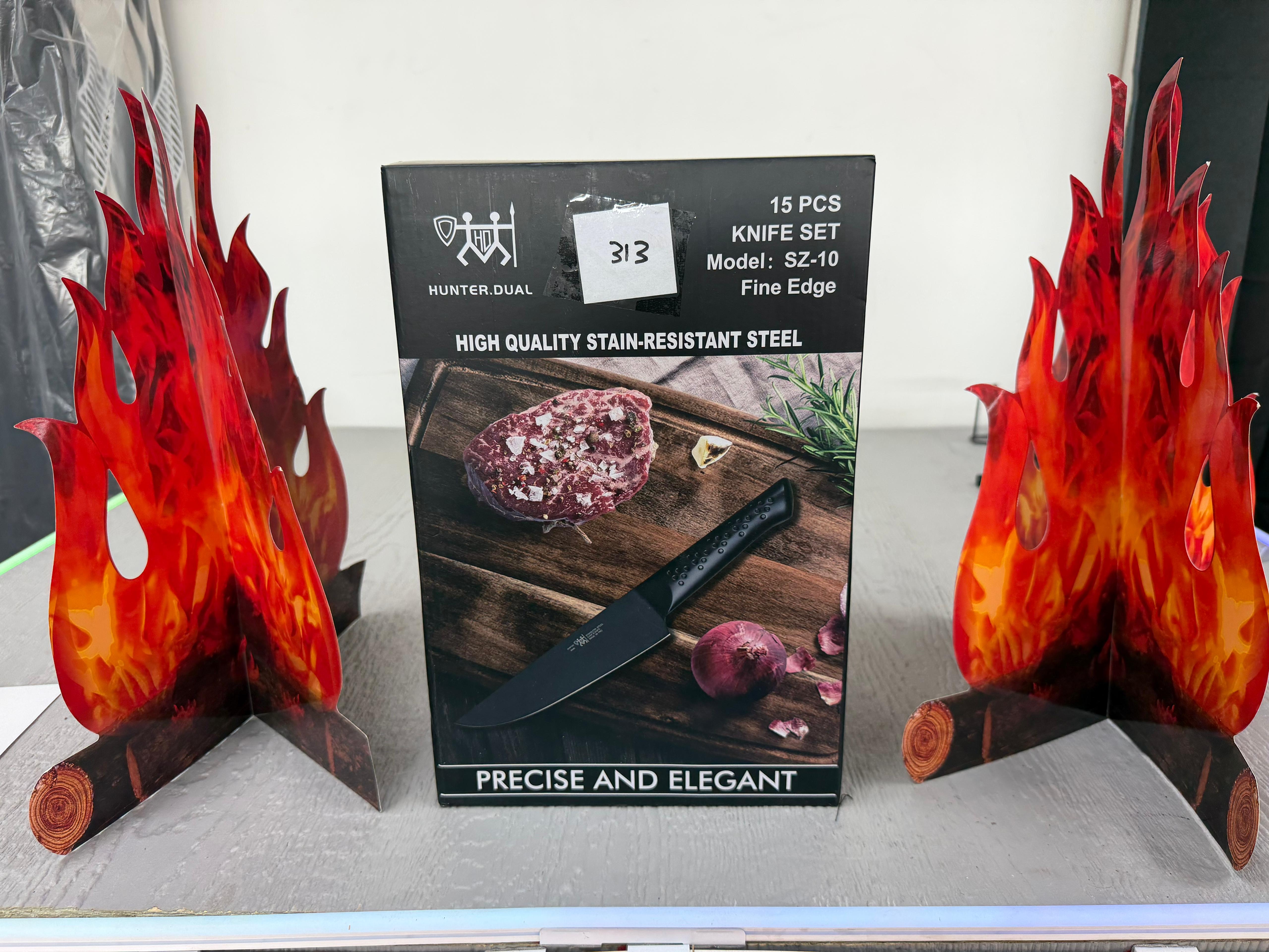 Arrtcy 15-piece kitchen knife set with a wooden block and sharpener.( F313)
