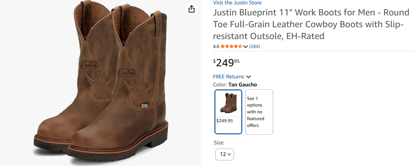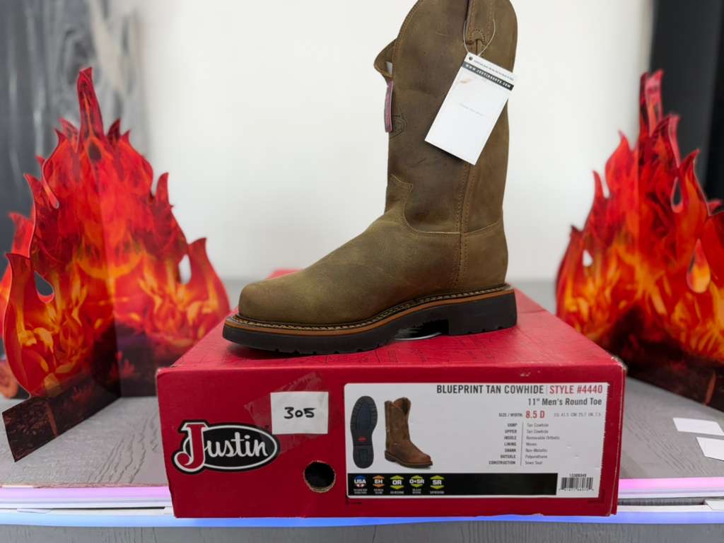 Justin Boots Blueprint 11-inch men's work boots in tan gaucho leather 8.5. (F305)