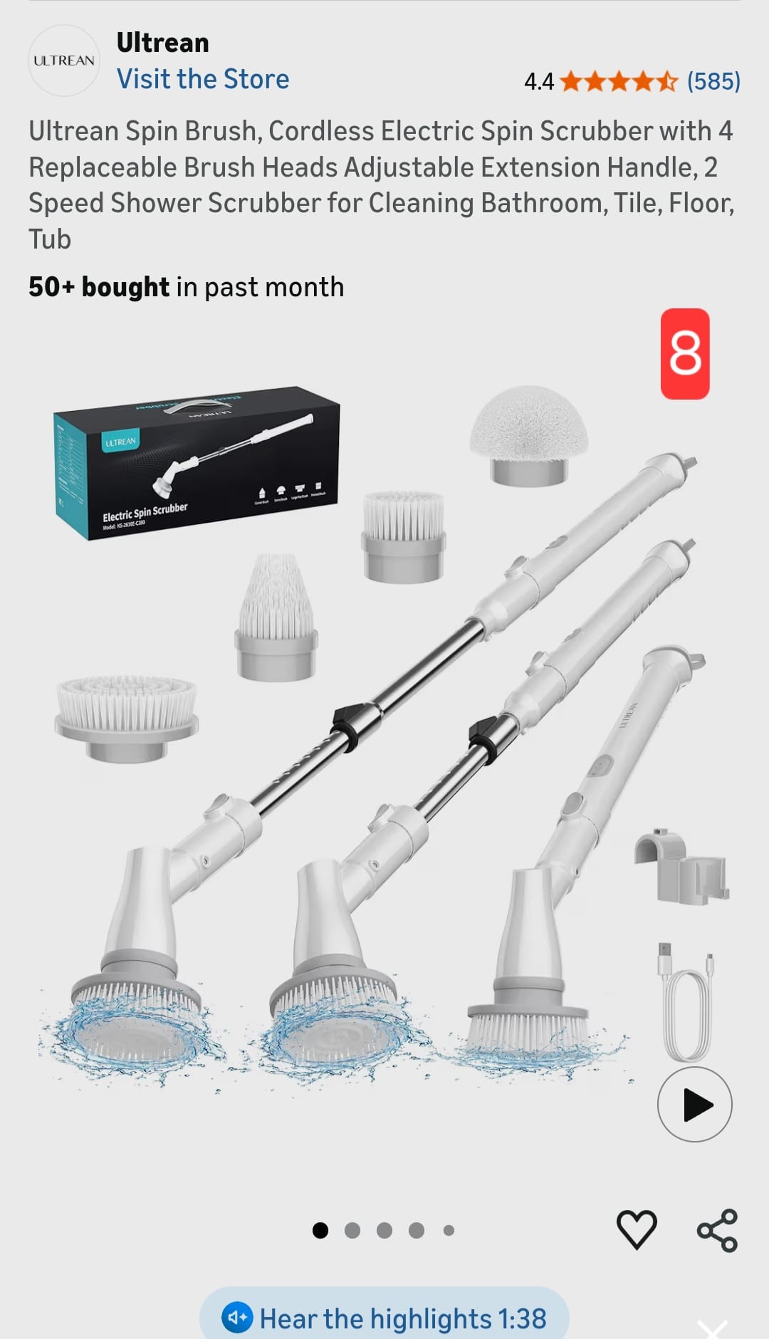 Ultrean Spin Brush, Cordless Electric Spin Scrubber with 4 Replaceable Brush Heads Adjustable Extension Handle. 8