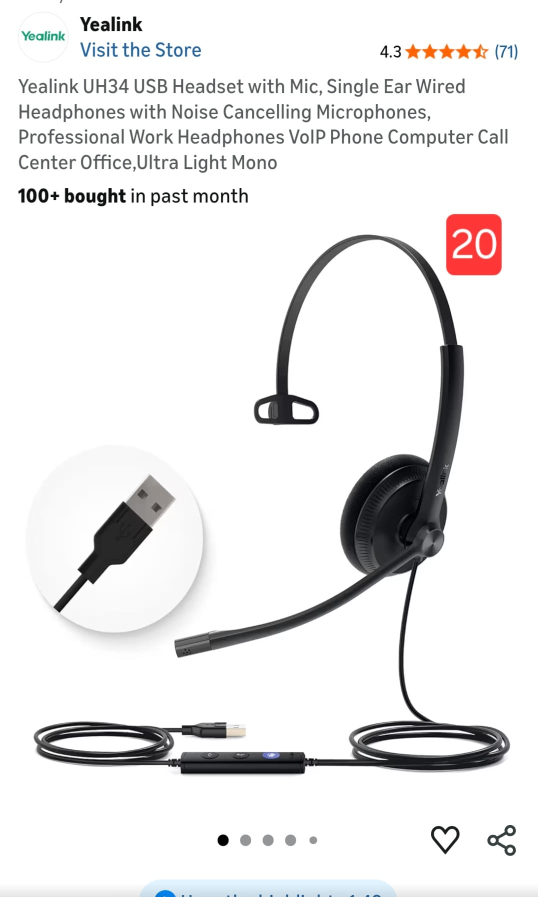 Yealink UH34 USB Headset with Mic, Single Ear Wired Headphones with Noise Cancelling Microphones. 20