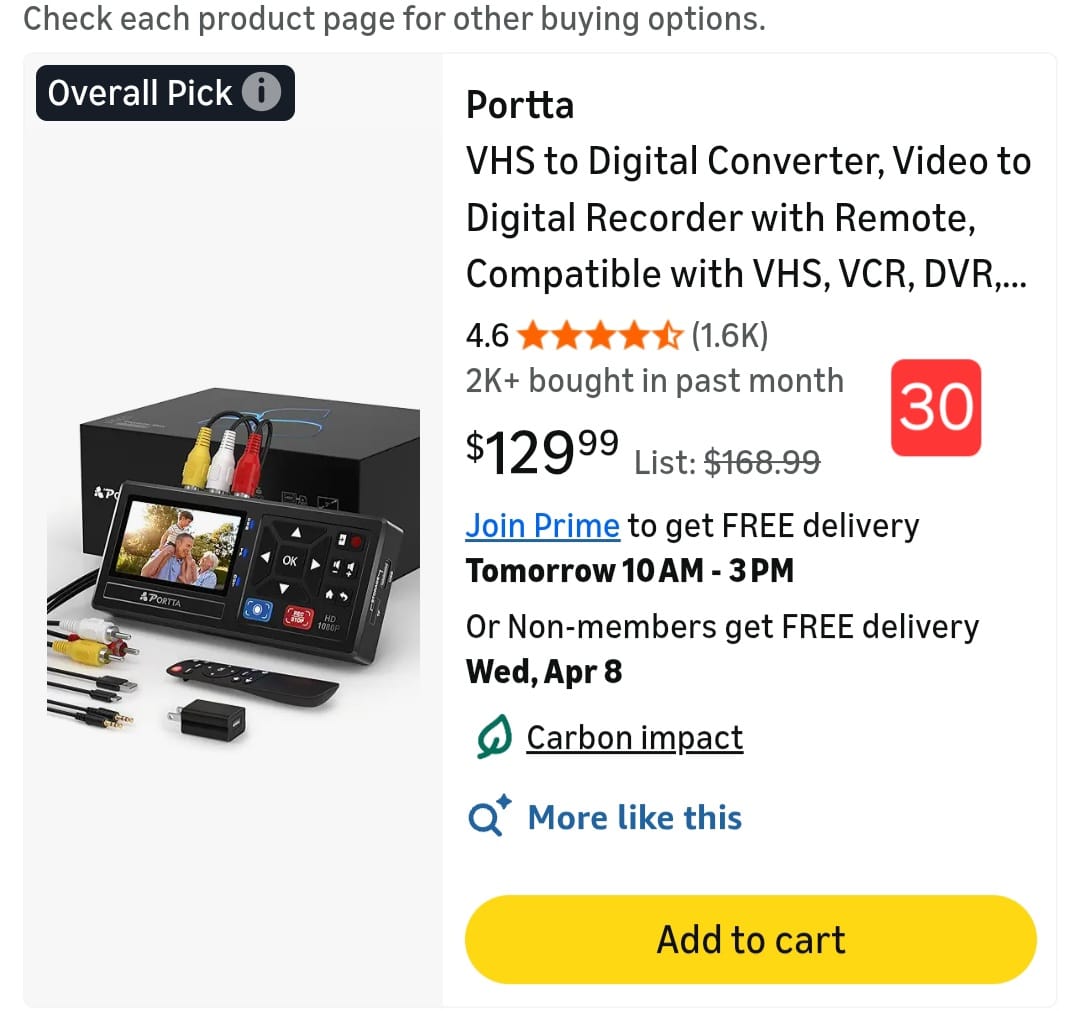 Portta VHS to Digital Converter, Video to Digital Recorder with Remote, Compatible with VHS, VCR, DVR,... 30