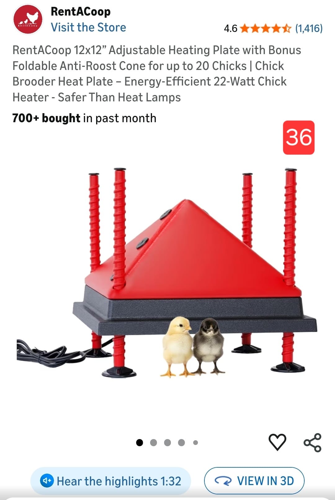 RentACoop 12x12" Adjustable Heating Plate with Bonus Foldable Anti-Roost Cone for up to 20 Chicks | Chick Brooder Heat Plate - Energy-Efficient 22-Watt Chick Heater - Safer Than Heat Lamps. 36