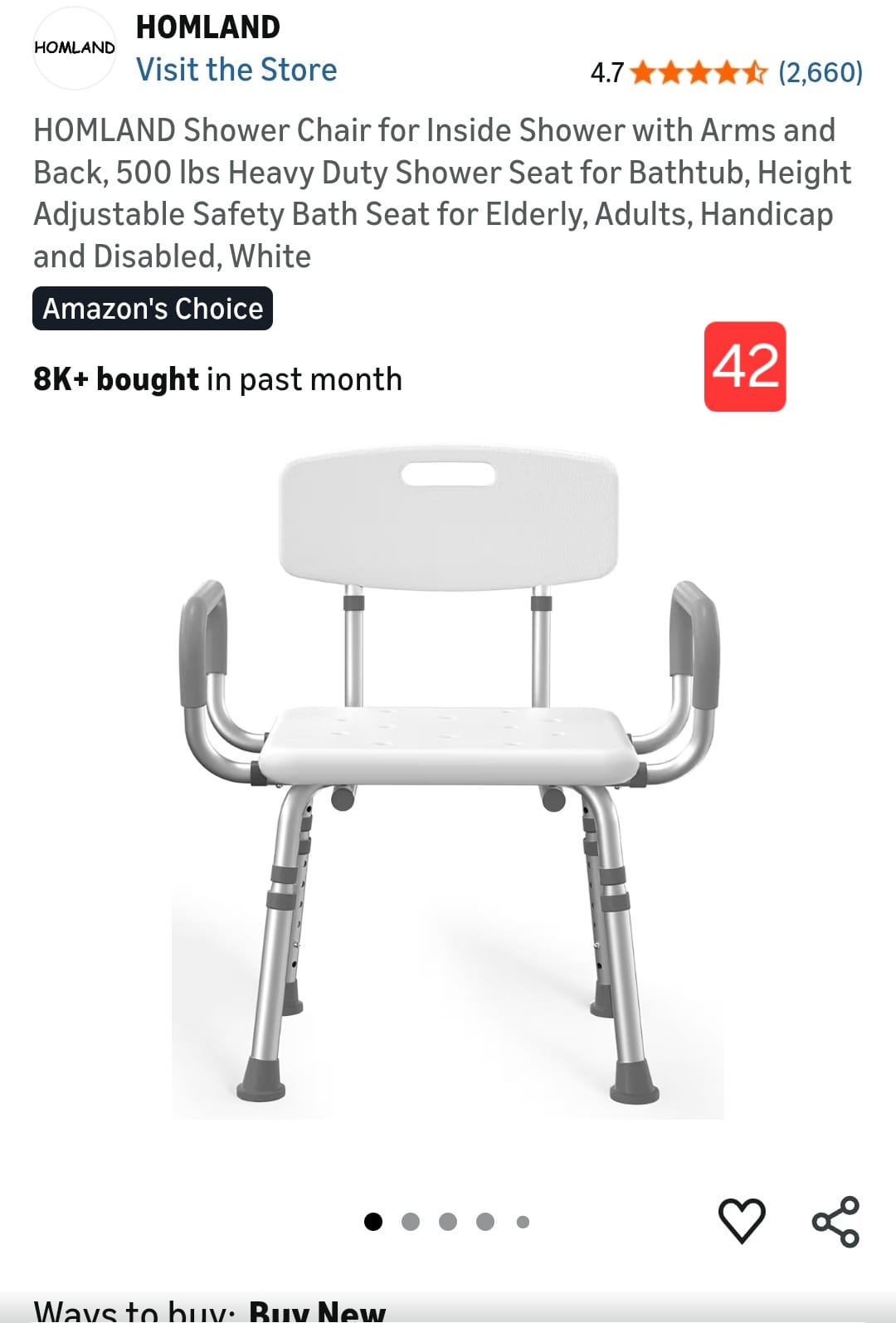 HOMLAND Shower Chair for Inside Shower with Arms and Back, 500 lbs Heavy Duty Shower Seat for Bathtub, Height Adjustable Safety Bath Seat for Elderly, Adults, Handicap and Disabled, White. 42