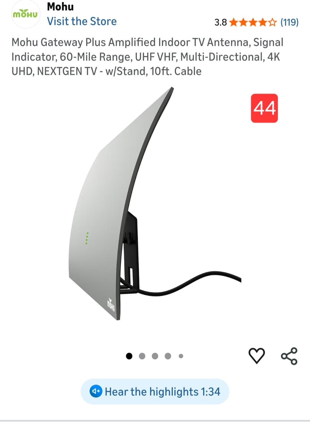 Mohu Gateway Plus Amplified Indoor TV Antenna, Signal Indicator, 60-Mile Range, UHF VHF, Multi-Directional, 4K UHD, NEXTGEN TV - w/Stand, 10ft. Cable. 44