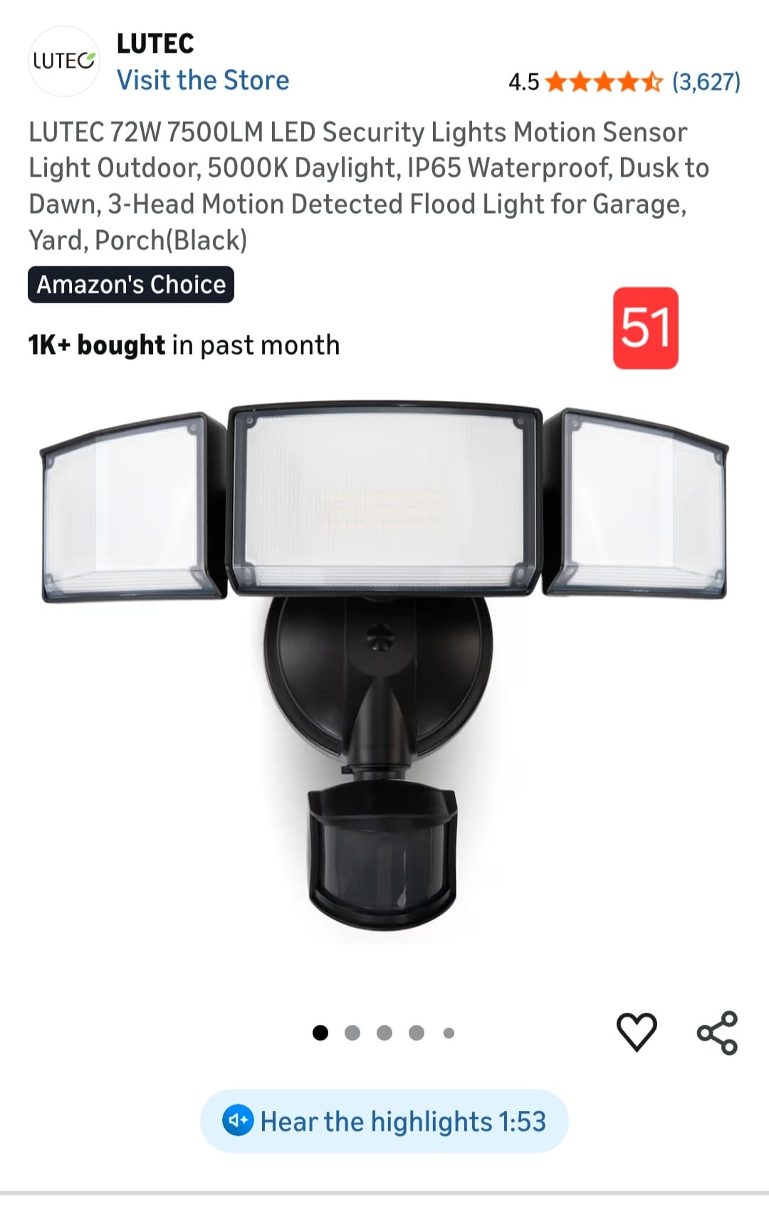 LUTEC 72W 7500LM LED Security Lights Motion Sensor Light Outdoor, 5000K Daylight, IP65 Waterproof, Dusk to Dawn, 3-Head Motion Detected Flood Light for Garage, Yard, Porch. 51