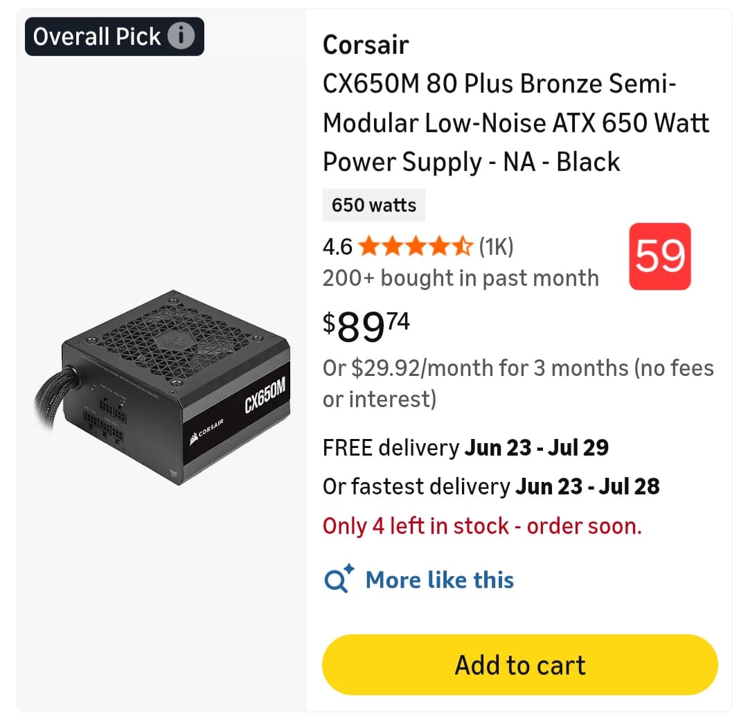 Corsair CX650M 80 Plus Bronze Semi-Modular Low-Noise ATX 650 Watt Power Supply - NA - Black. 59