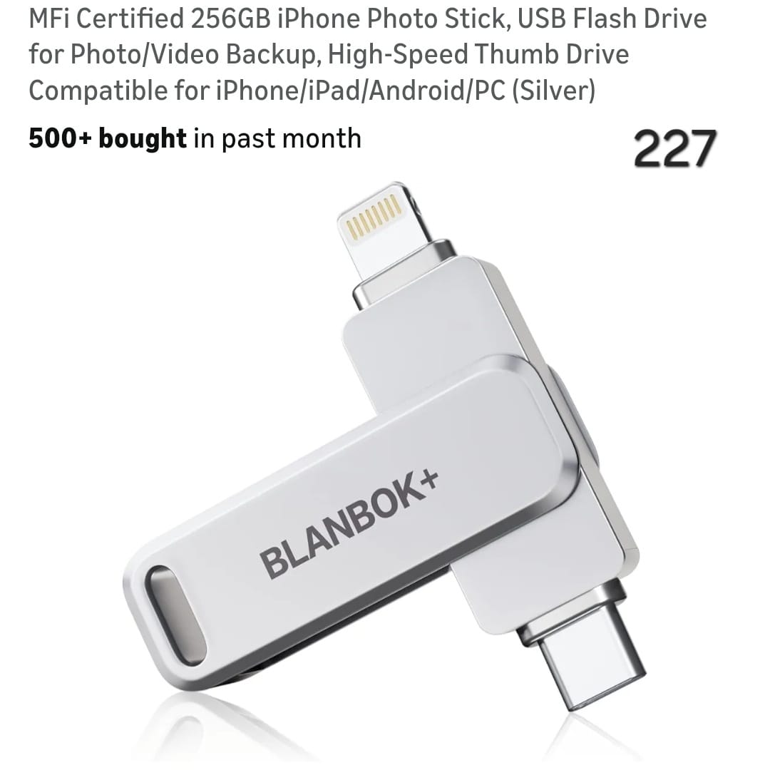 MFi Certified 256GB iPhone Photo Stick, USB Flash Drive for Photo/Video Backup, High-Speed Thumb Drive Compatible for iPhone/iPad/Android/PC (Silver). Lv227