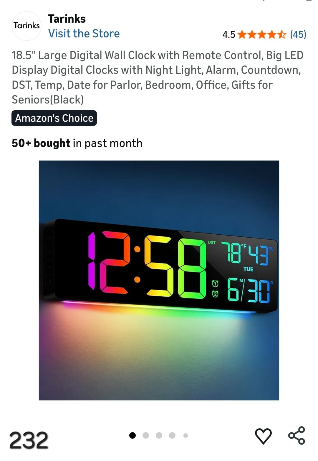 18.5" Large Digital Wall Clock with Remote Control, Big LED Display Digital Clocks with Night Light, Alarm, Countdown, DST, Temp, Date for Parlor, Bedroom, Office, Gifts for Seniors(Black). Lv232
