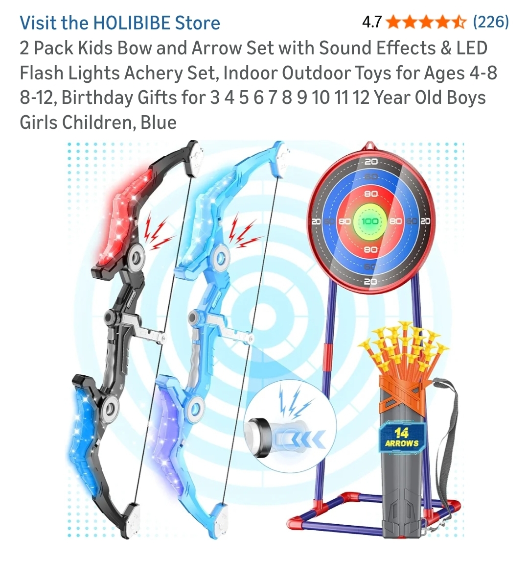 2 Pack Kids Bow and Arrow Set with Sound Effects & LED Flash Lights Achery Set, Indoor Outdoor Toys for Ages 4-8 8-12, Birthday Gifts for 3 4 5 6 7 8 9 10 11 12 Year Old Boys Girls Children, Blue. Lv263