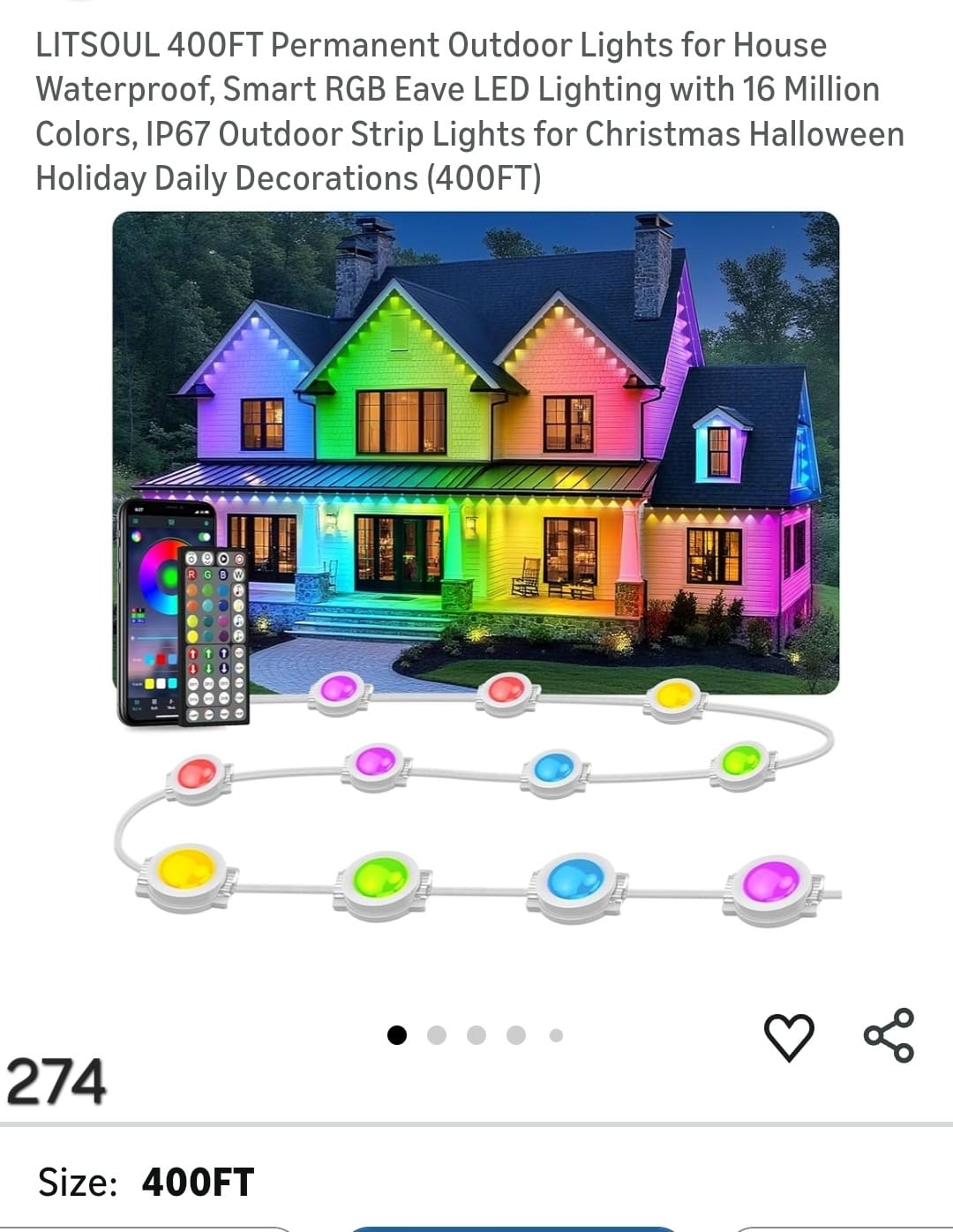 LITSOUL 400FT Permanent Outdoor Lights for House Waterproof, Smart RGB Eave LED Lighting with 16 Million Colors, IP67 Outdoor Strip Lights for Christmas Halloween Holiday Daily Decorations (400FT). Lv274
