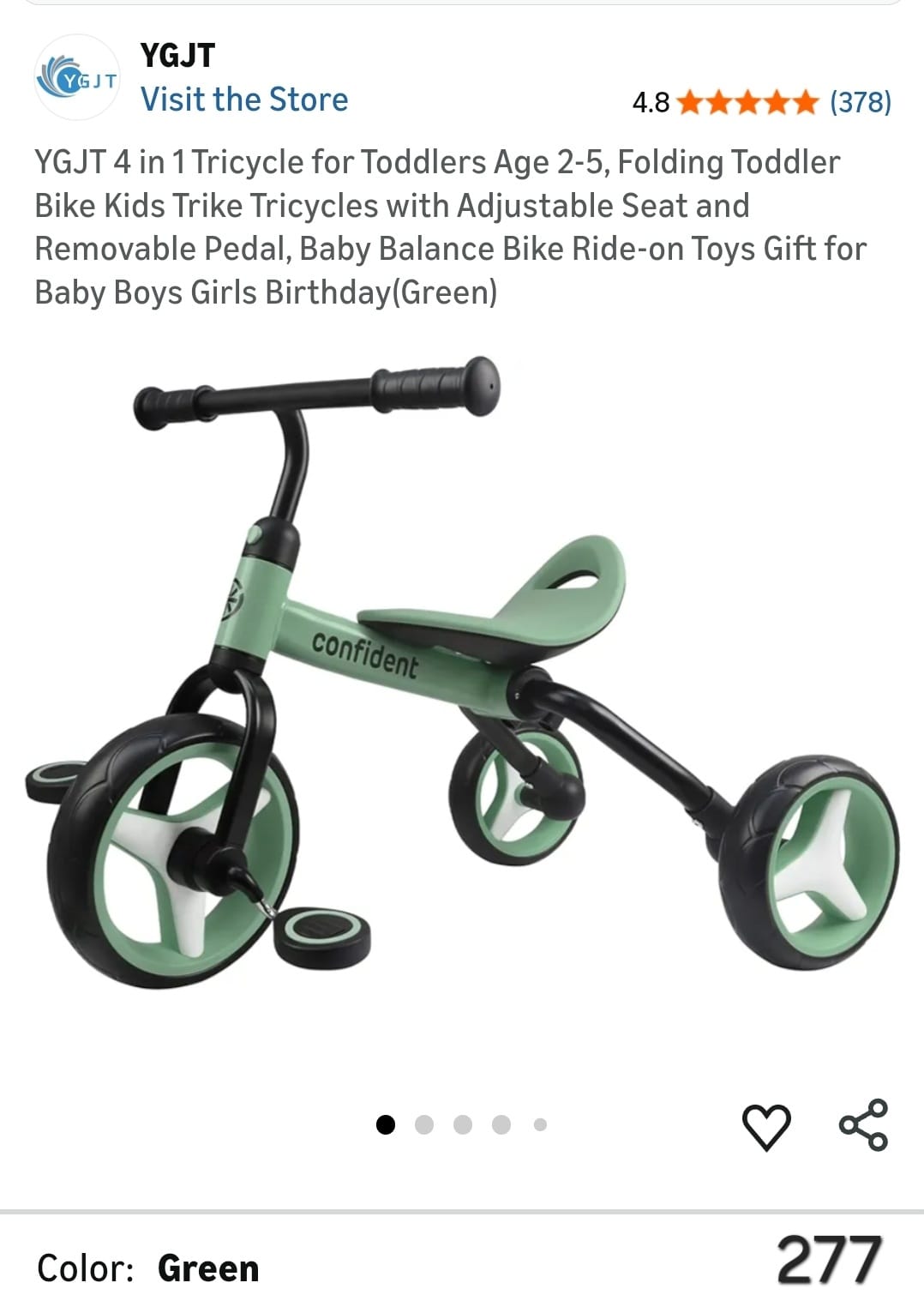 YGJT 4 in 1 Tricycle for Toddlers Age 2-5, Folding Toddler Bike Kids Trike Tricycles with Adjustable Seat and Removable Pedal, Baby Balance Bike Ride-on Toys Gift for Baby Boys Girls Birthday (Green). Lv277