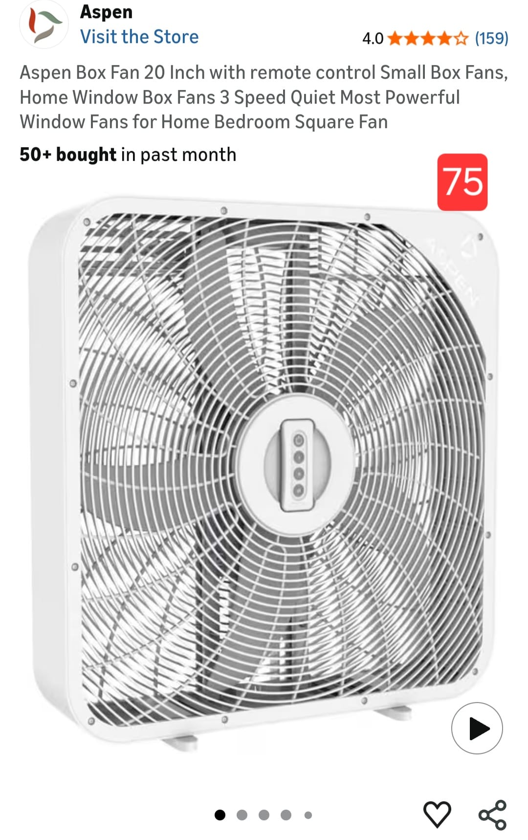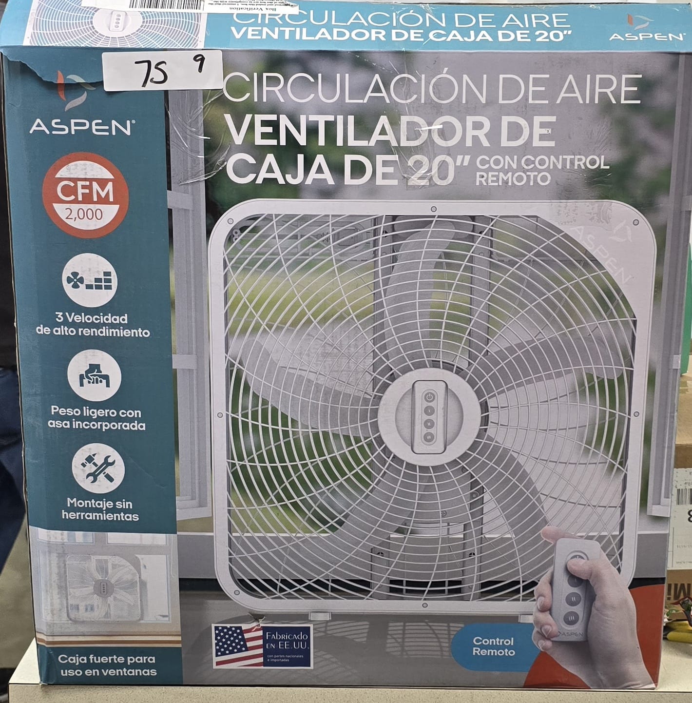 Aspen Box Fan 20 Inch with remote control Small Box Fans, Home Window Box Fans 3 Speed Quiet Most Powerful Window Fans for Home Bedroom Square Fan. 75