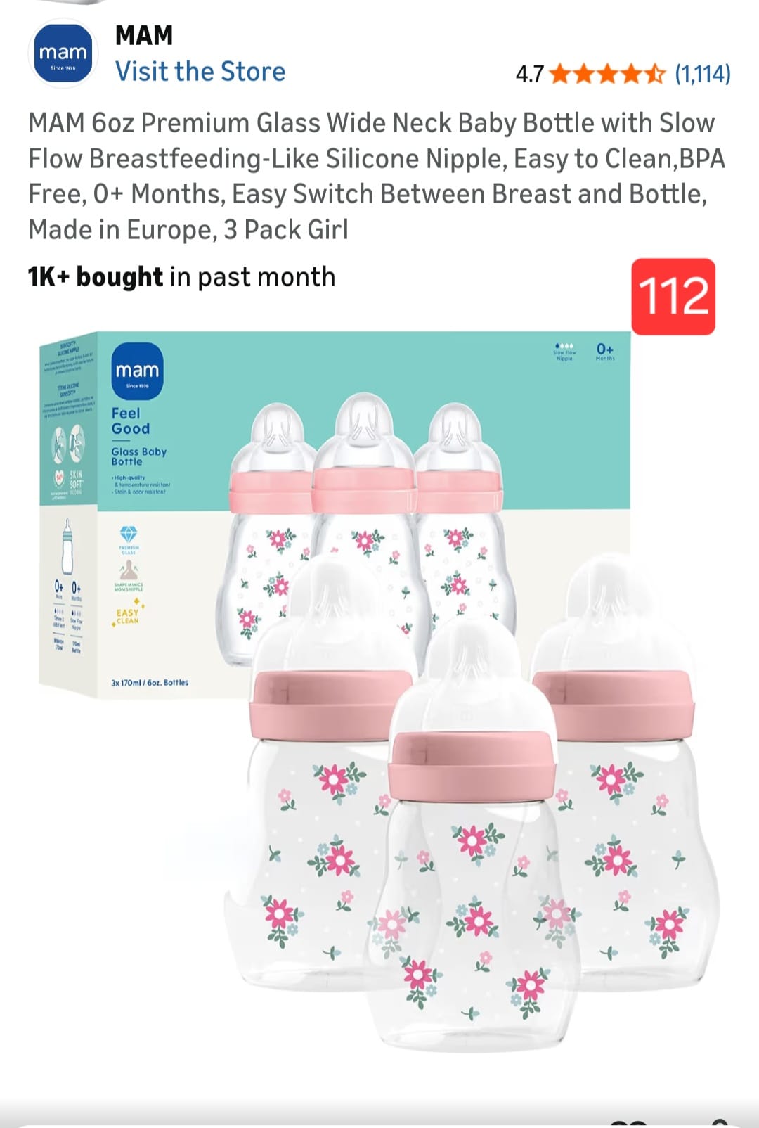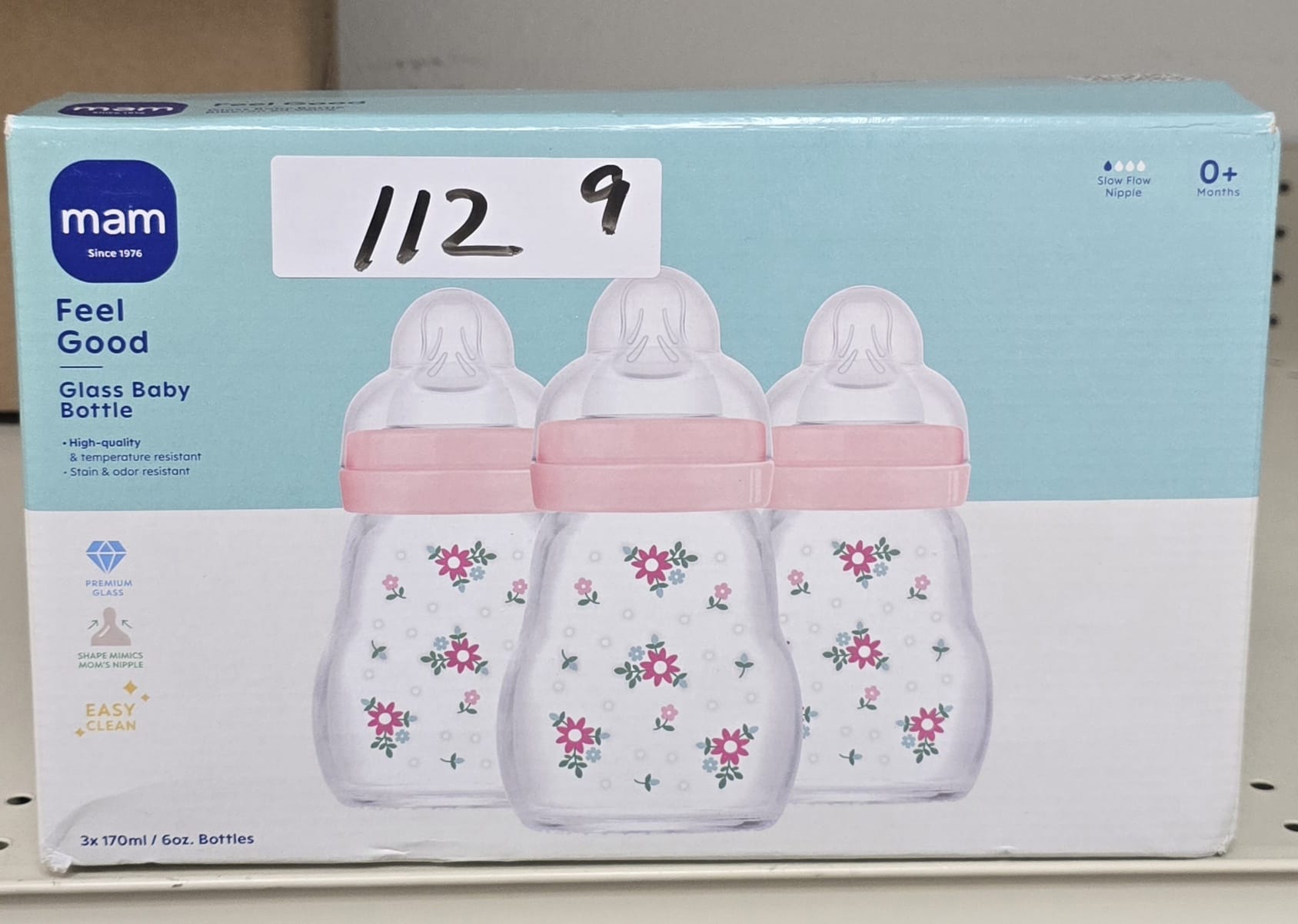 MAM 6oz Premium Glass Wide Neck Baby Bottle with Slow Flow Breastfeeding. 112
