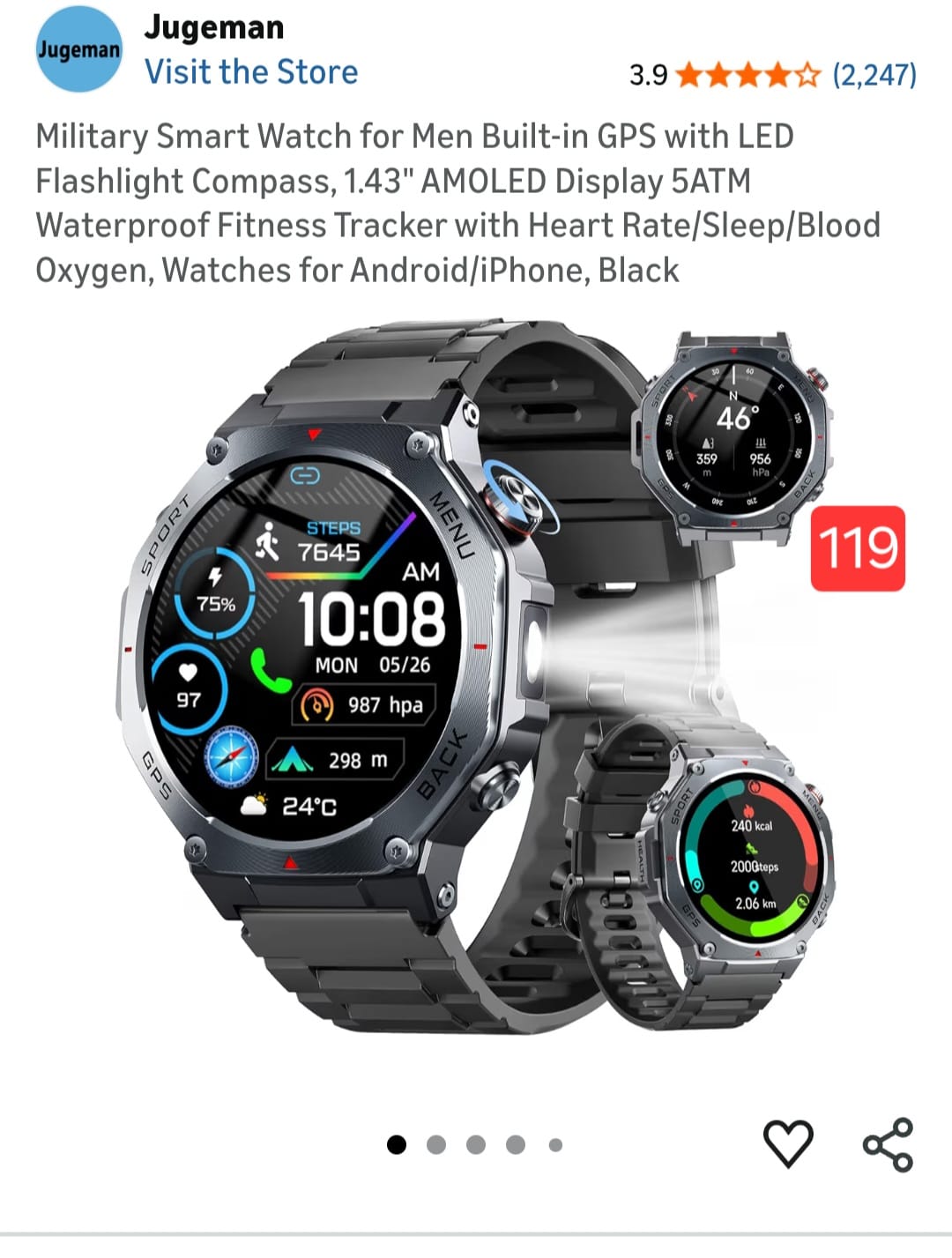 Military Smart Watch for Men Built-in GPS with LED Flashlight Compass, 1.43" AMOLED Display 5ATM Waterproof Fitness Tracker with Heart Rate/Sleep/Blood Oxygen, Watches for Android/iPhone. 119