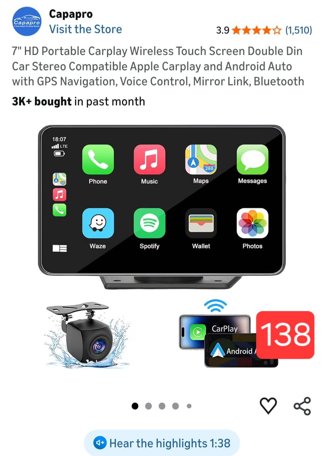 7" HD Portable Carplay Wireless Touch Screen Double Din Car Stereo Compatible Apple Carplay and Android Auto with GPS Navigation, Voice Control, Mirror Link, Bluetooth. 138