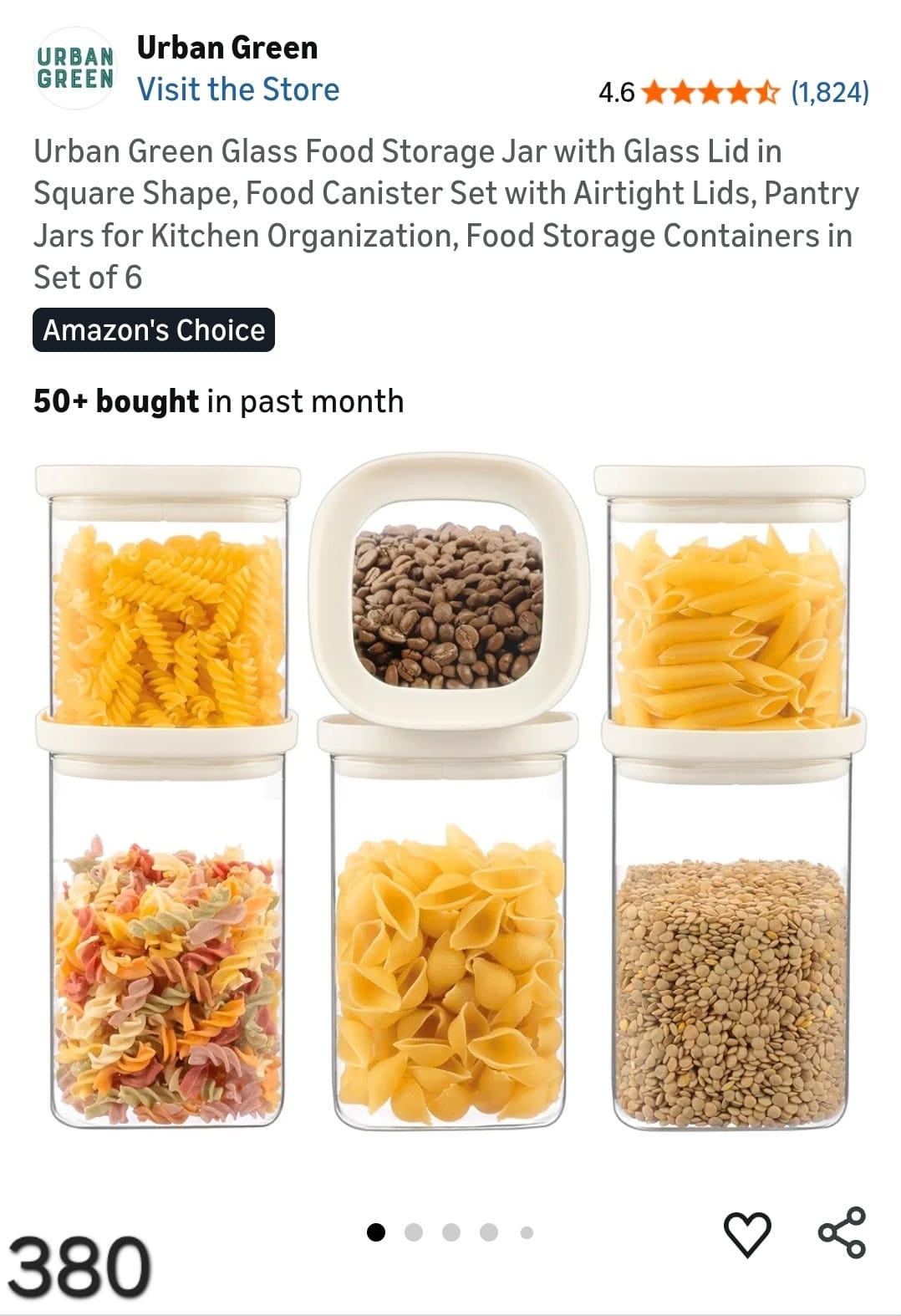Urban Green Glass Food Storage Jar with Glass Lid in Square Shape, Food Canister Set with Airtight Lids, Pantry Jars for Kitchen Organization, Food Storage Containers in Set of 6. Lv380