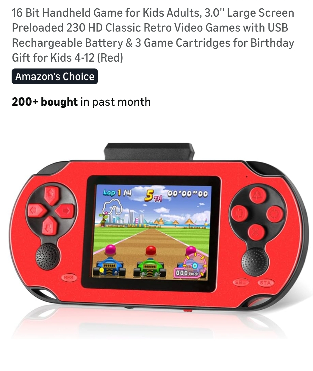 16 Bit Handheld Game for Kids Adults, 3.0" Large Screen Preloaded 230 HD Classic Retro Video Games with USB Rechargeable Battery & 3 Game Cartridges for Birthday Gift for Kids 4-12 (Red). Lv441