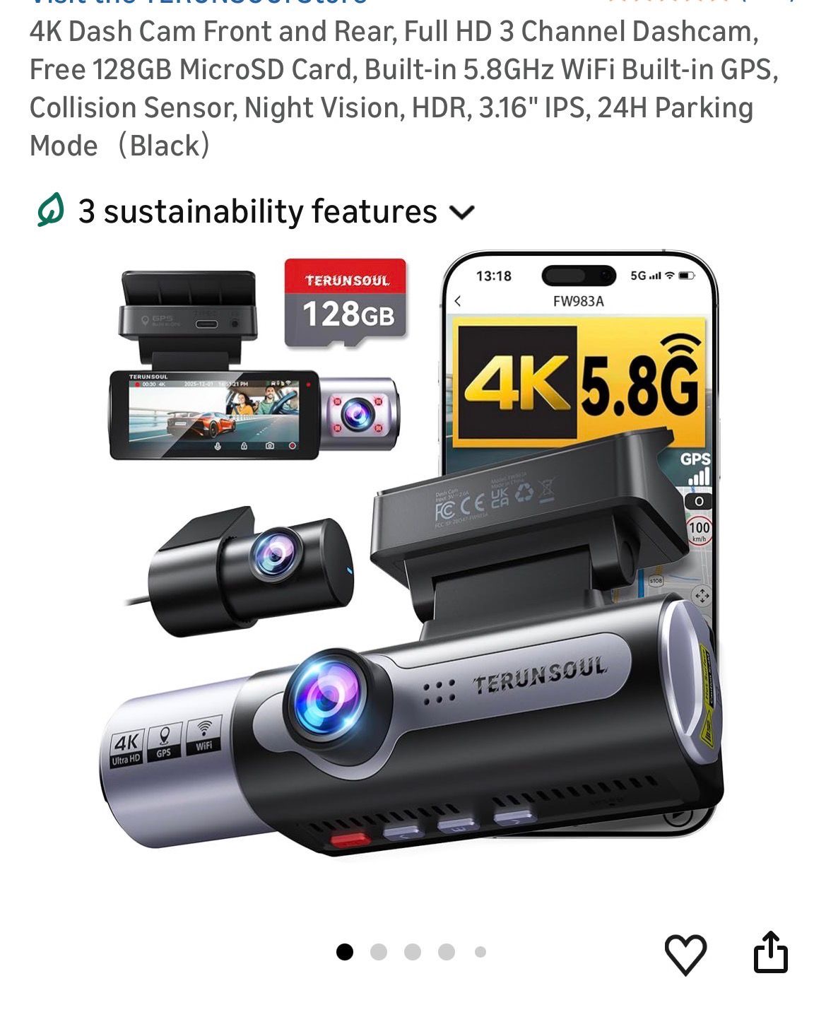 4K Dash Cam Front and Rear, Full HD 3 Channel Dashcam, Free 128GB MicroSD Card, Built-in 5.8GHz WiFi Built-in GPS, Collision Sensor, Night Vision, HDR, 3.16" IPS, 24H Parking Mode (A147)