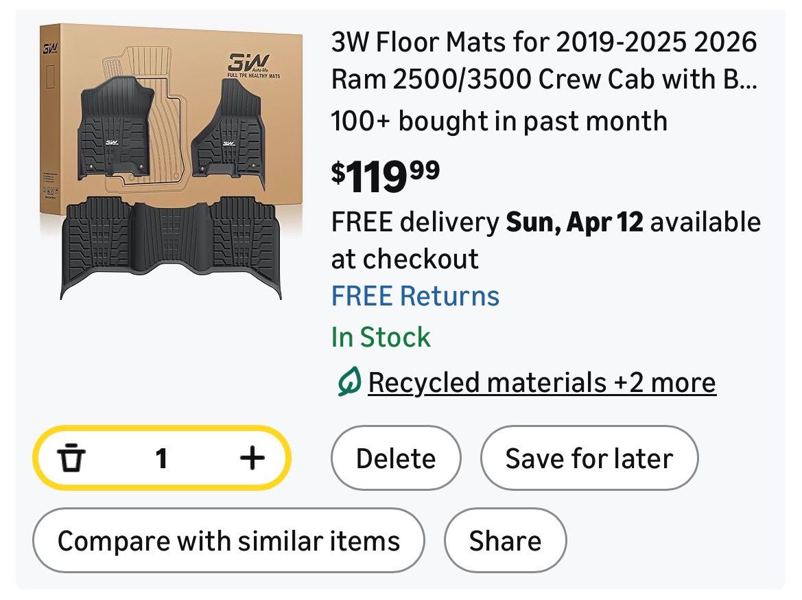 3W brand floor mats are designed specifically for 2019-2026 Ram 2500/3500 Crew Cab trucks. (A165)