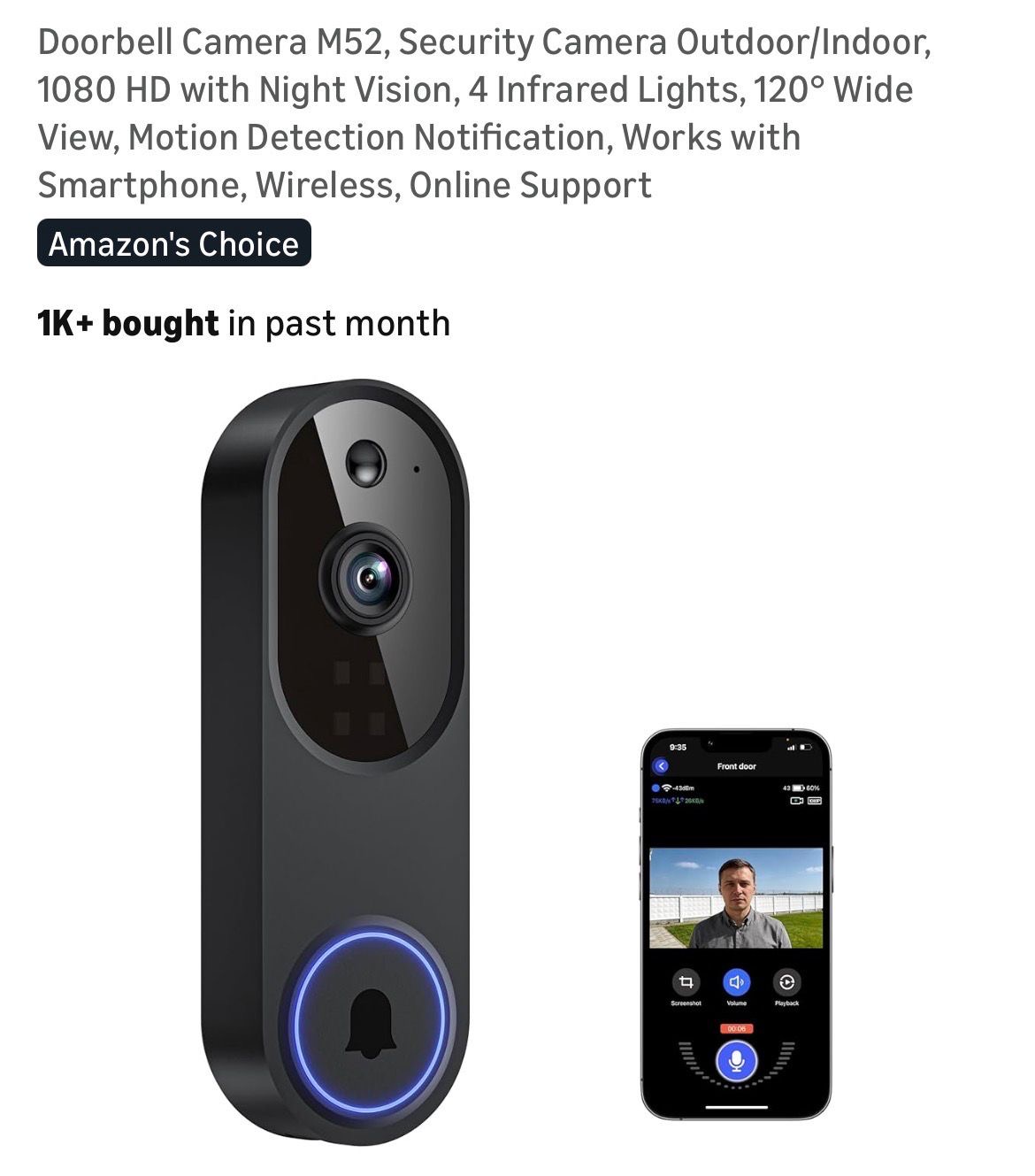 Doorbell Camera M52, Security Camera Outdoor/Indoor, 1080 HD with Night Vision, 4 Infrared Lights, 120° Wide View, Motion Detection Notification, Works with Smartphone, Wireless, Online Support (A198)