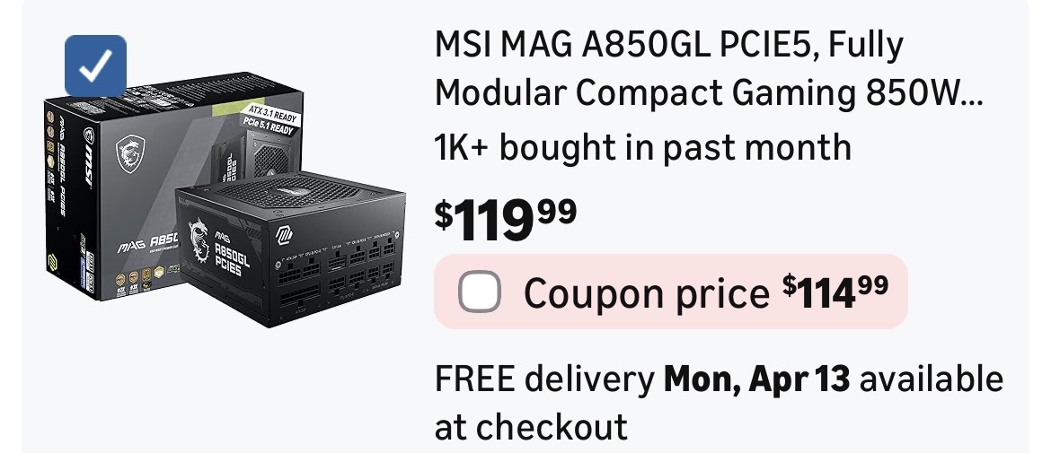 MSI MAG A850GL PCIE5, Fully Modular Compact Gaming 850W Power Supply #K13