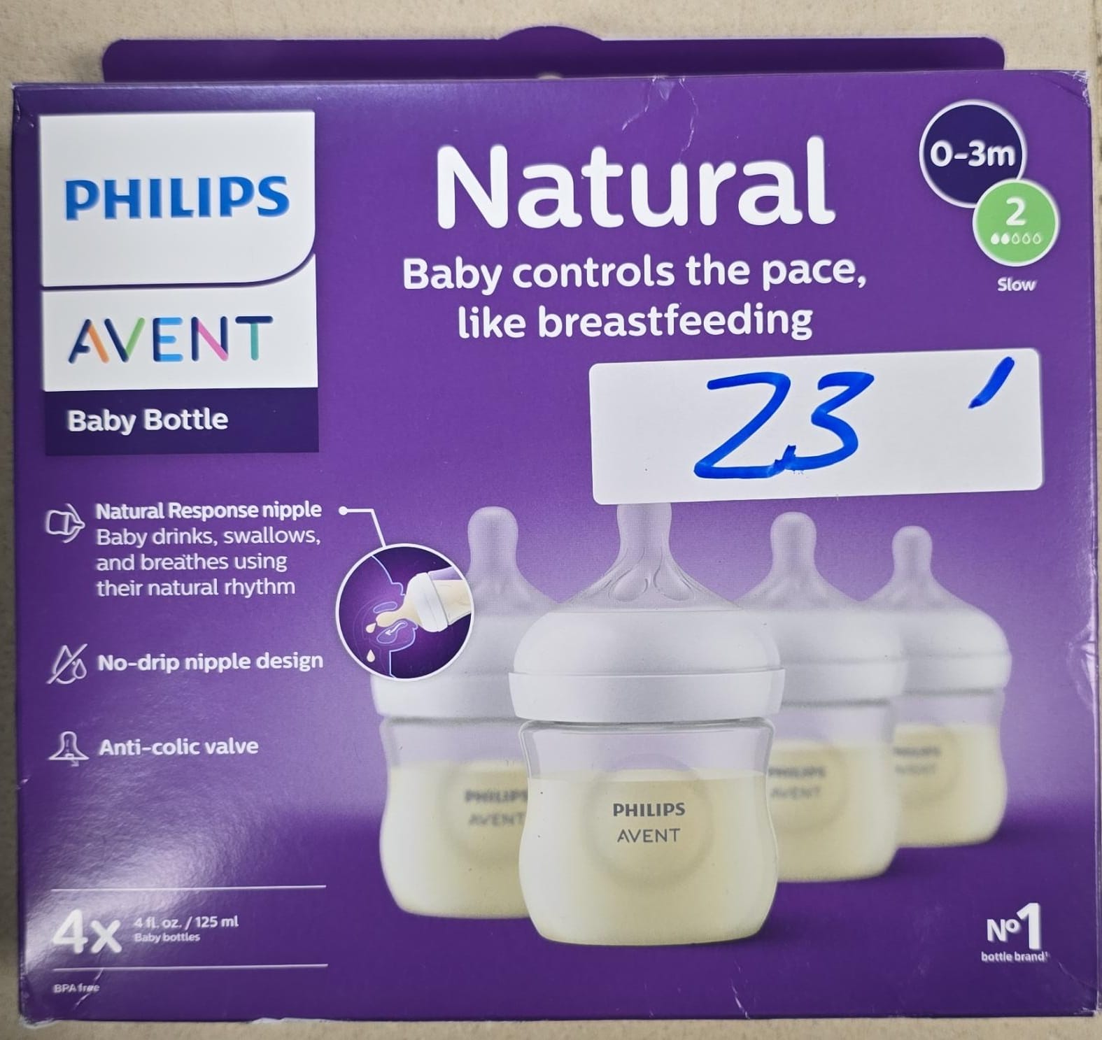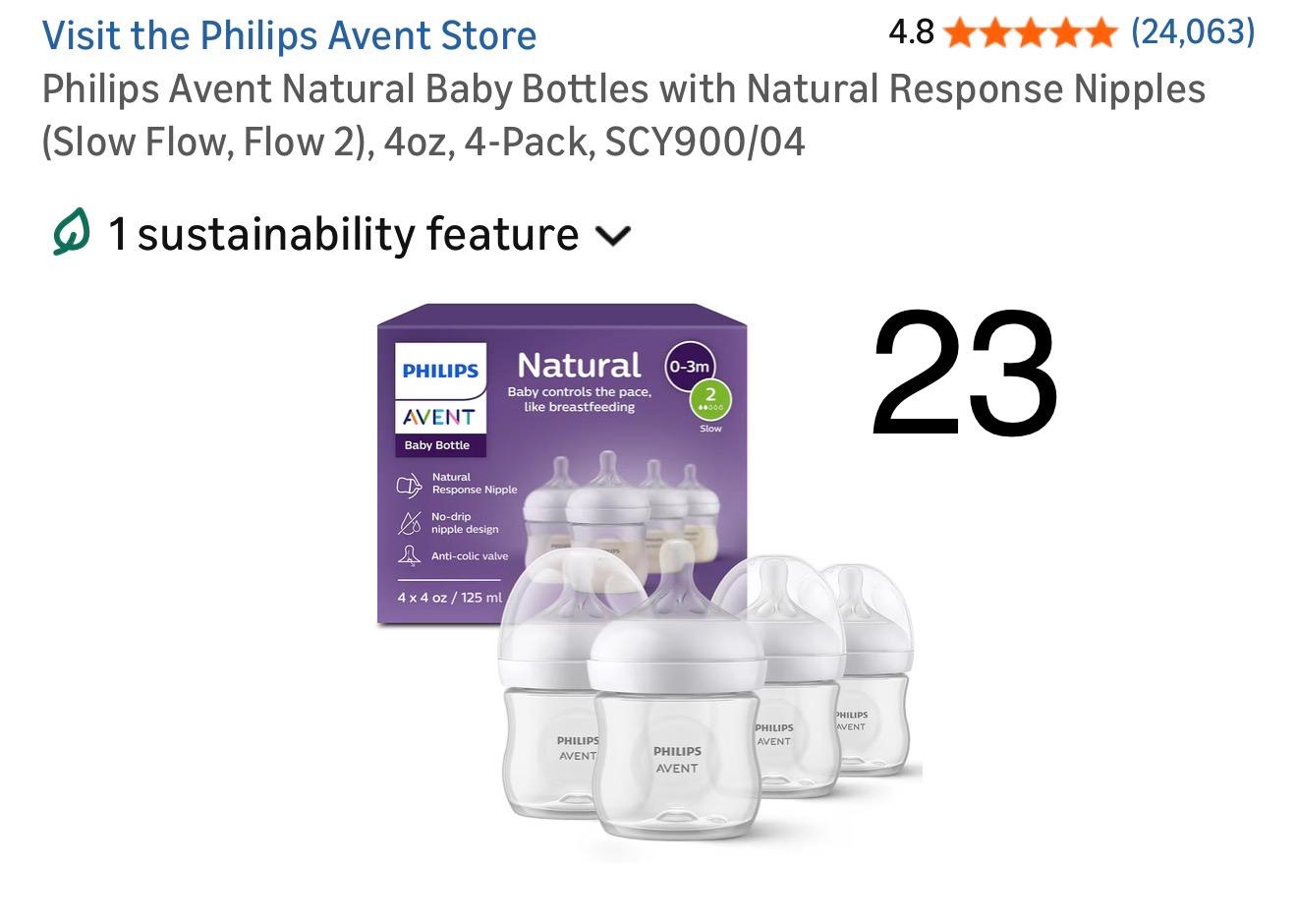 Philips Avent Natural Baby Bottles with Natural Response Nipples (Slow Flow, Flow 2), 4oz, 4-Pack, SCY900/04. 23