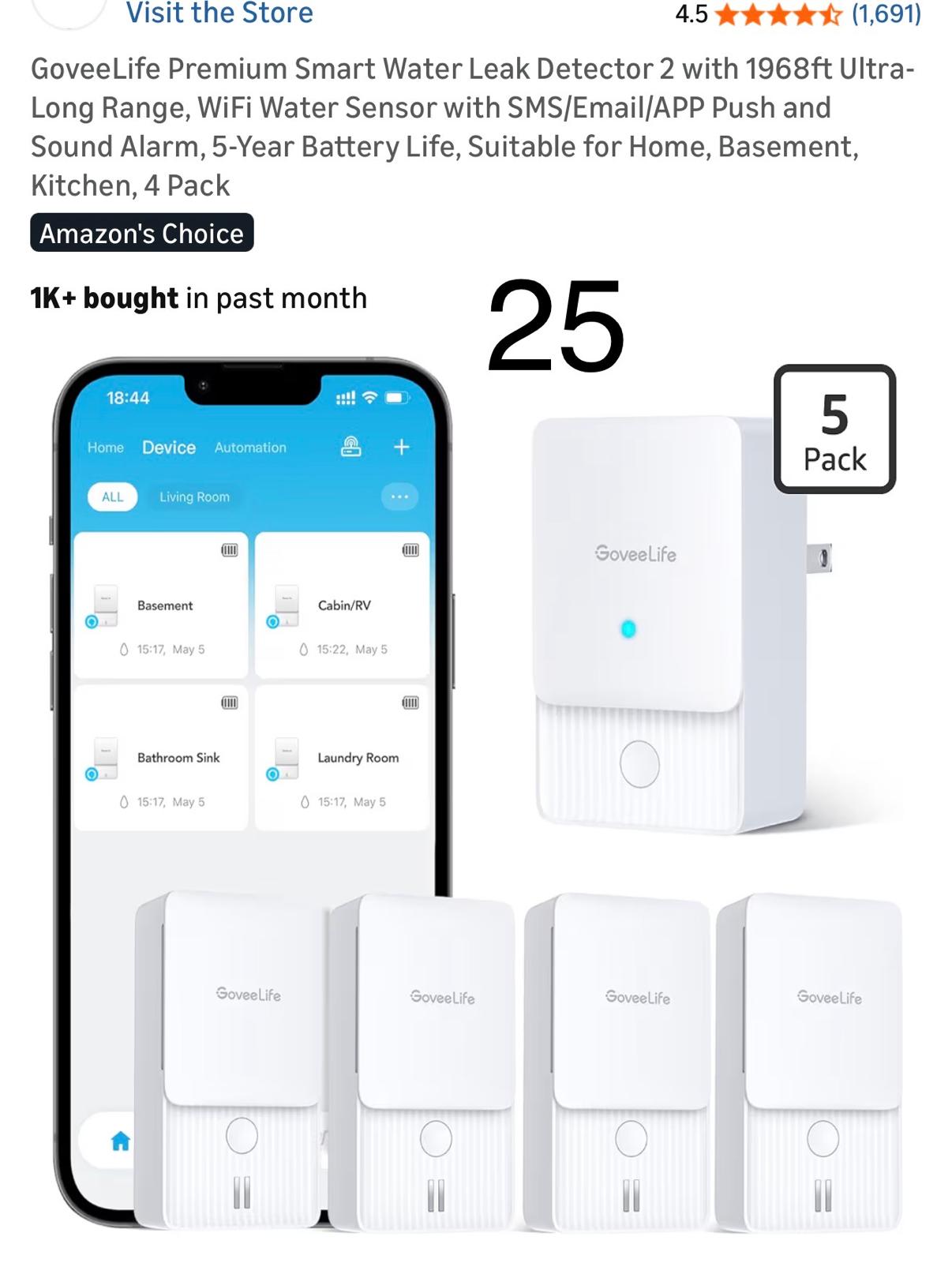 GoveeLife Premium Smart Water Leak Detector 2 with 1968ft Ultra-Long Range, WiFi Water Sensor with SMS/Email/APP Push and Sound Alarm, 5-Year Battery Life, Suitable for Home, Basement, Kitchen. 25