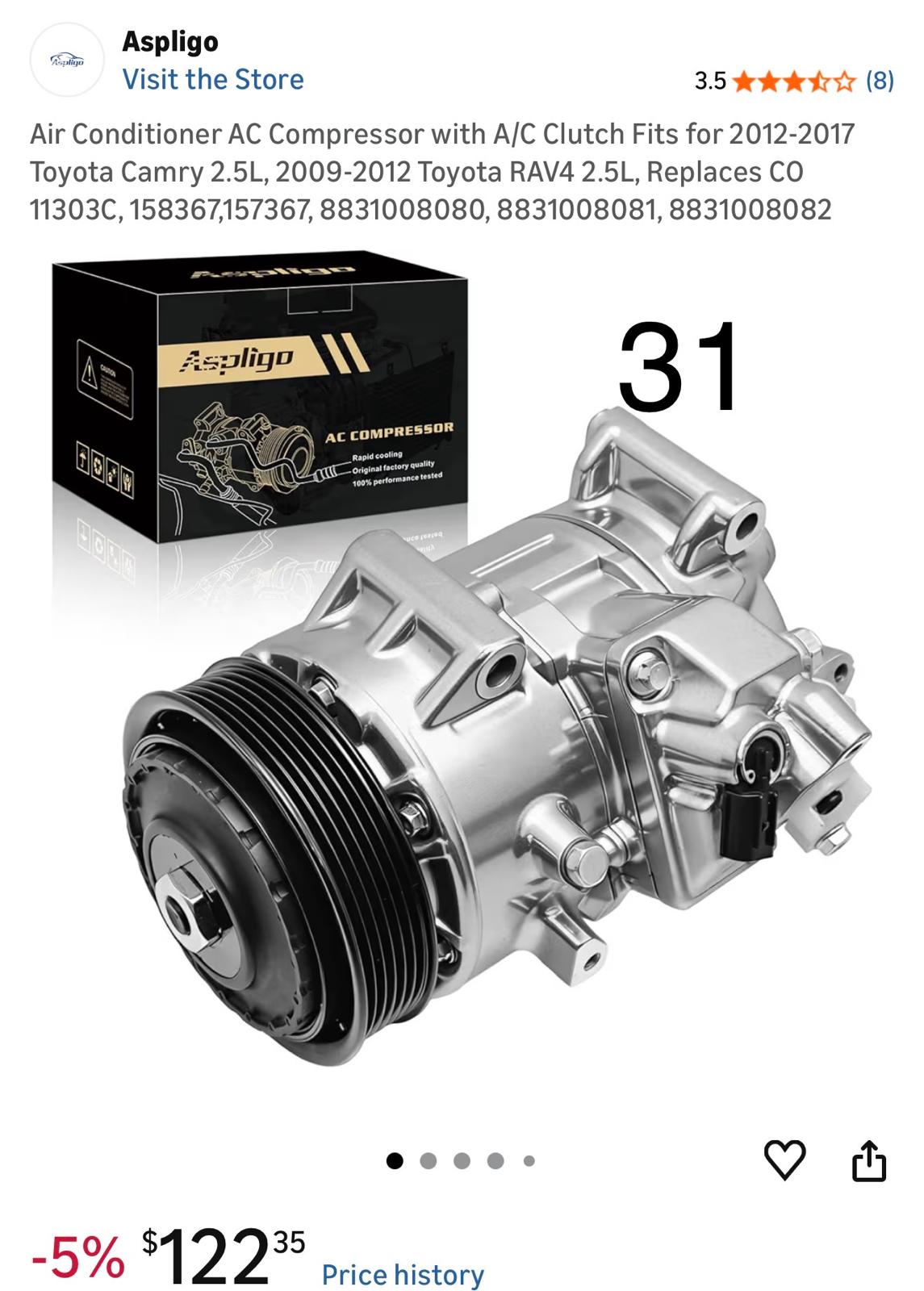 Air Conditioner AC Compressor with A/C Clutch Fits for 2012-2017 Toyota Camry 2.5L, 2009-2012 Toyota RAV4 2.5L, Replaces CO 113030, 158367,157367, 8831008080, 8831008081, 8831008082. 31