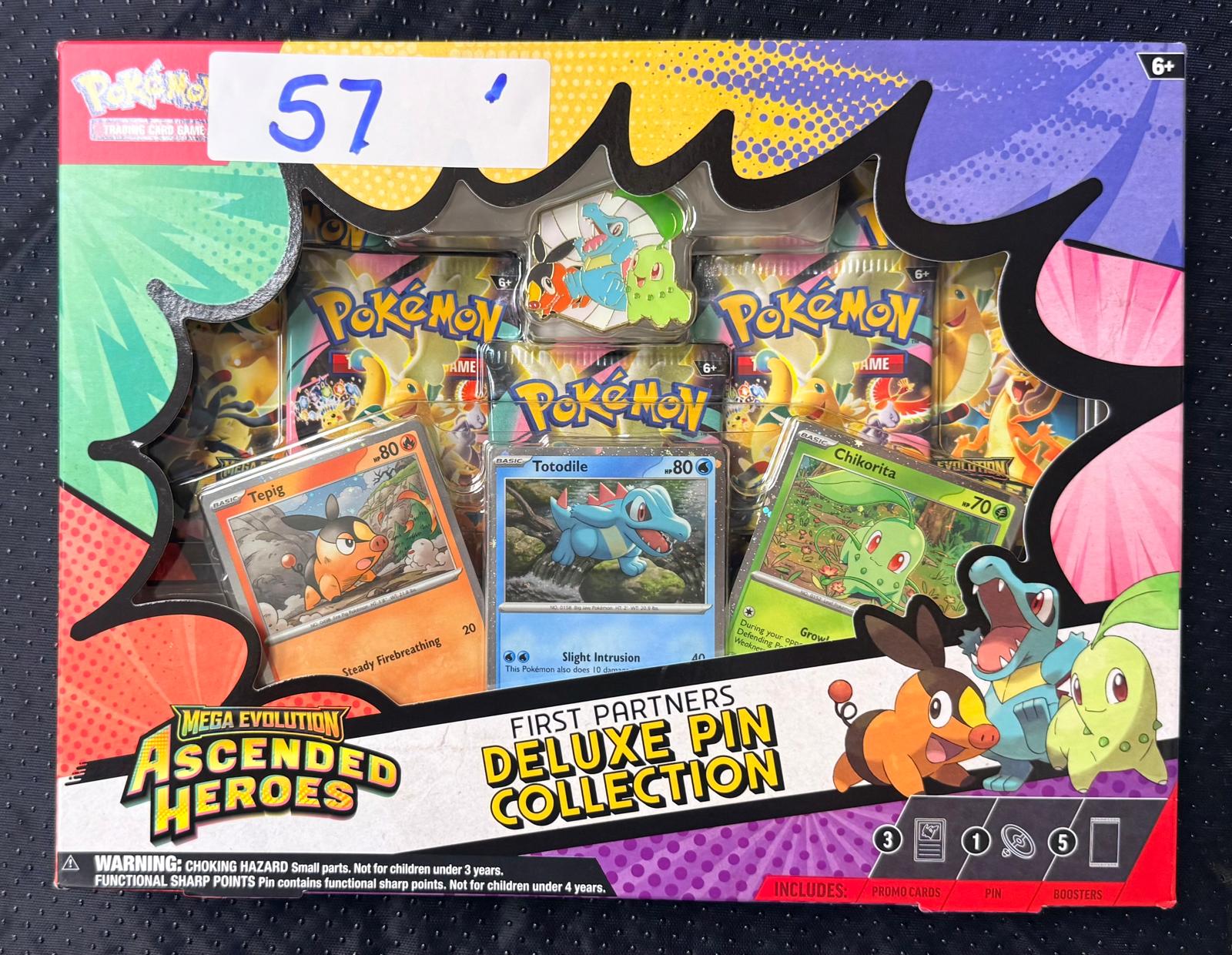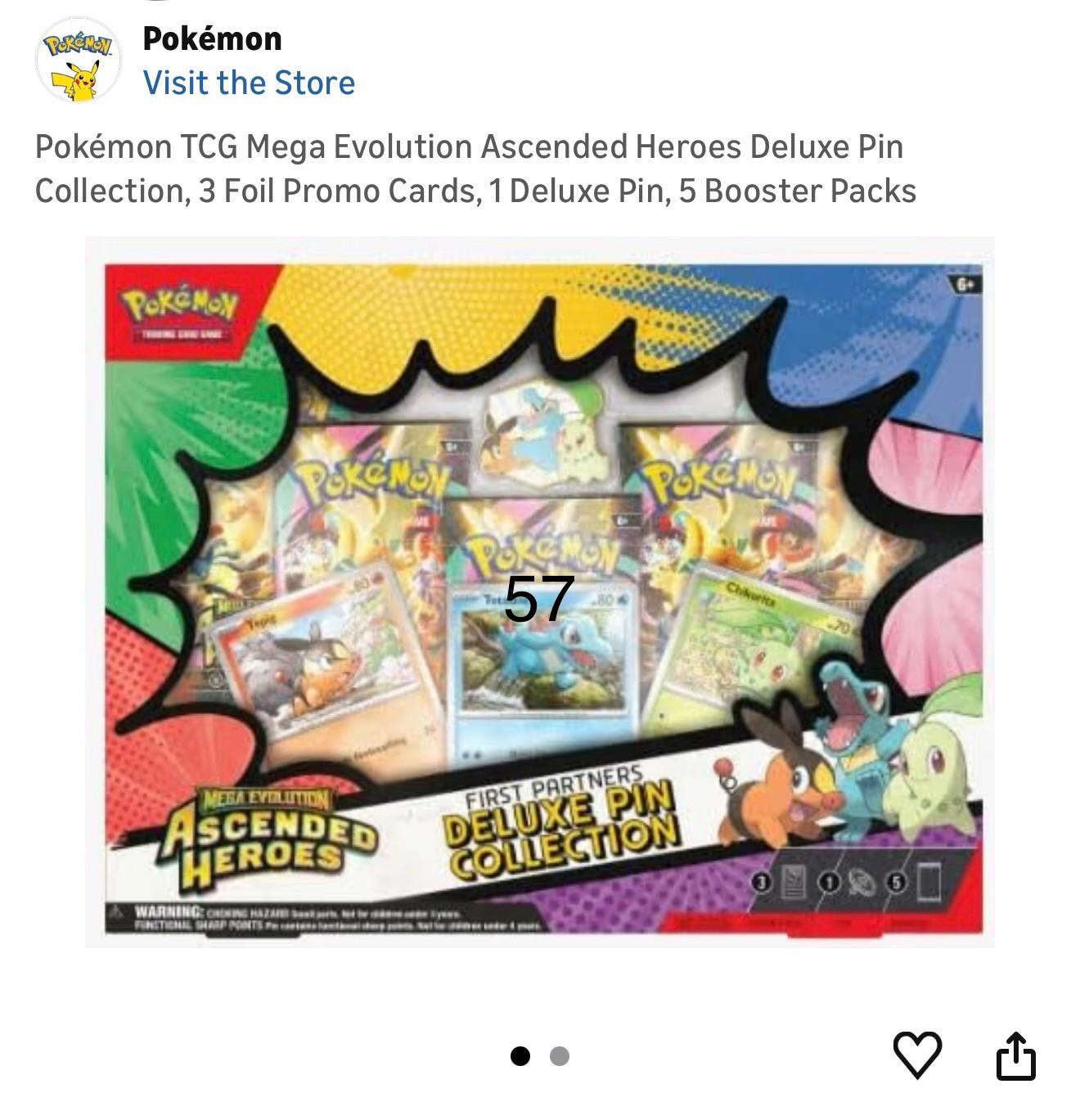 Pokémon TCG Mega Evolution Ascended Heroes Deluxe Pin Collection, 3 Foil Promo Cards, 1 Deluxe Pin, 5 Booster Packs. 57