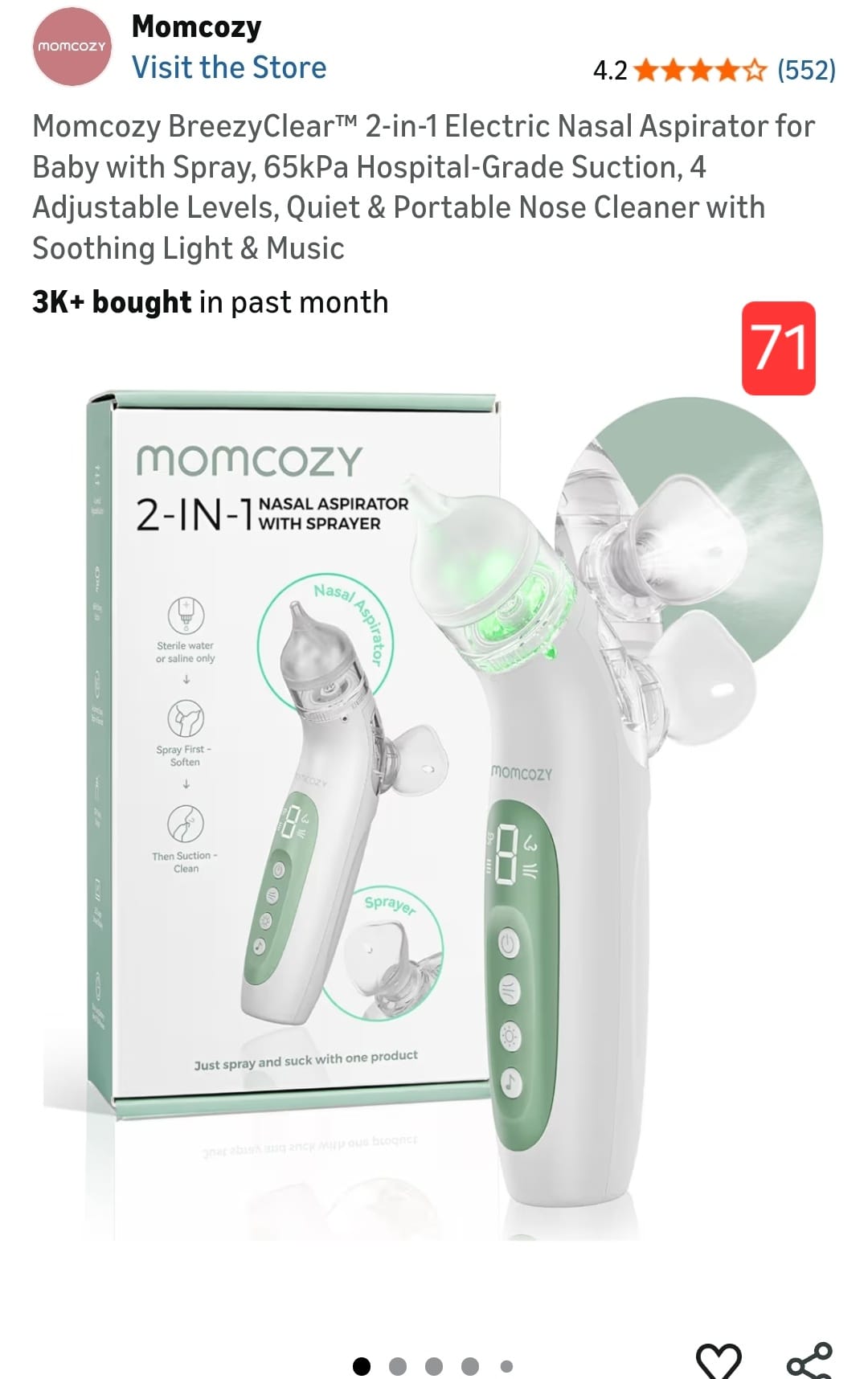 Momcozy BreezyClear™ 2-in-1 Electric Nasal Aspirator for Baby with Spray, 65kPa Hospital-Grade Suction, 4 Adjustable Levels, Quiet & Portable Nose Cleaner with Soothing Light & Music. 71