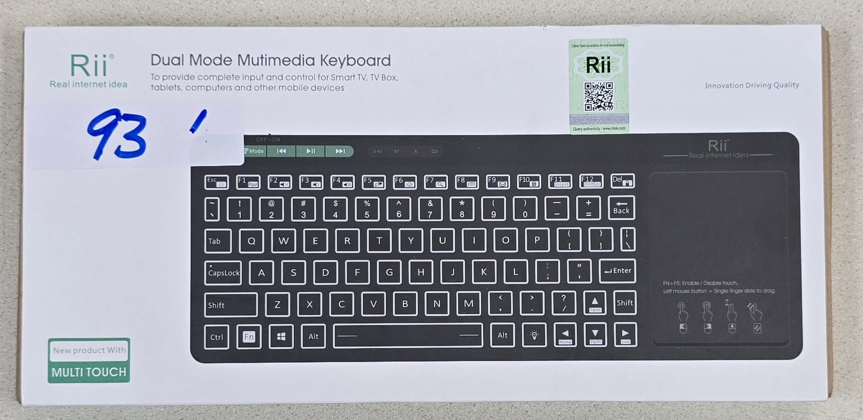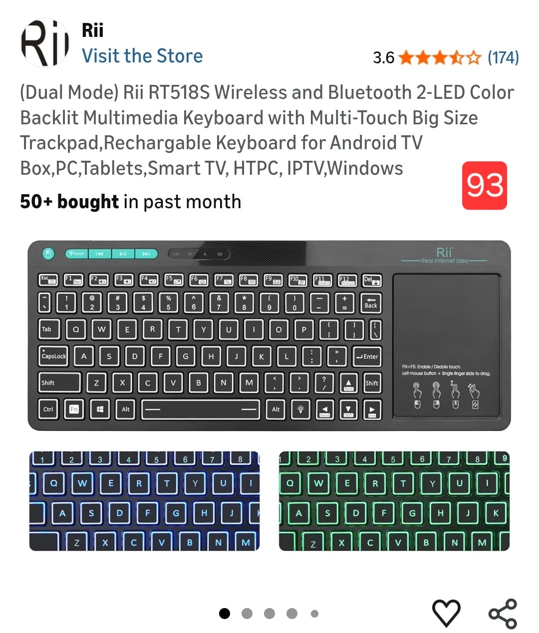 Dual Mode) Rii RT518S Wireless and Bluetooth 2-LED Color Backlit Multimedia Keyboard with Multi-Touch Big Size Trackpad, Rechargable Keyboard for Android TV Box, PC, Tablets, Smart TV, HTPC, IPTV, Windows. 93