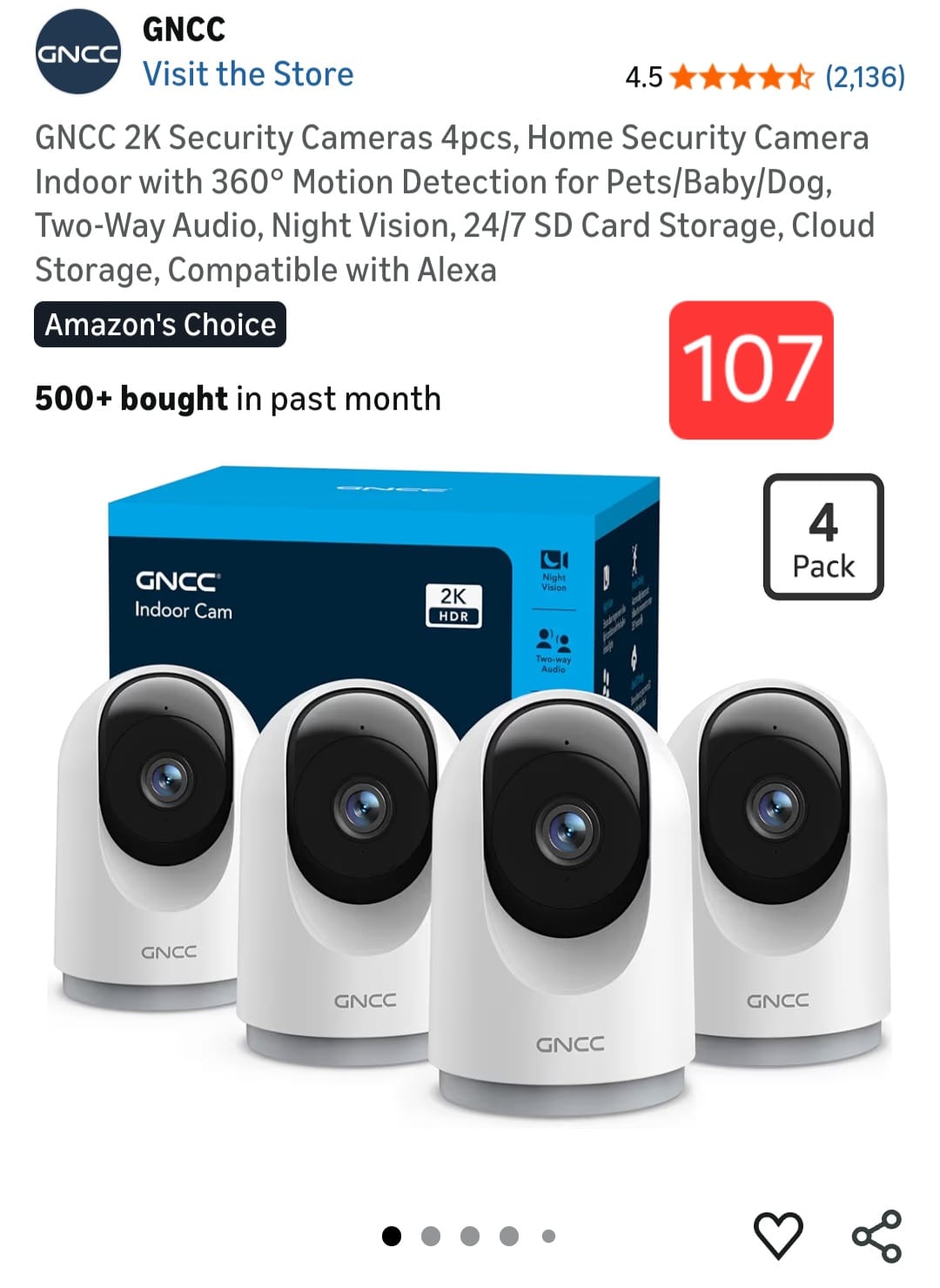 GNCC 2K Security Cameras 4pcs, Home Security Camera Indoor with 360° Motion Detection for Pets/Baby/Dog, Two-Way Audio, Night Vision, 24/7 SD Card Storage, Cloud Storage, Compatible with Alexa. 107
