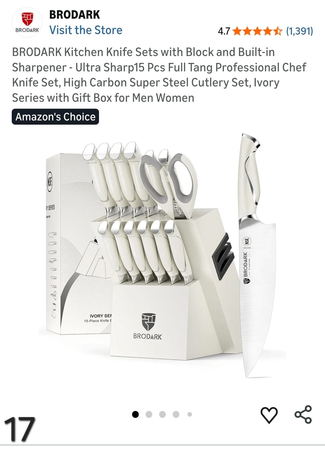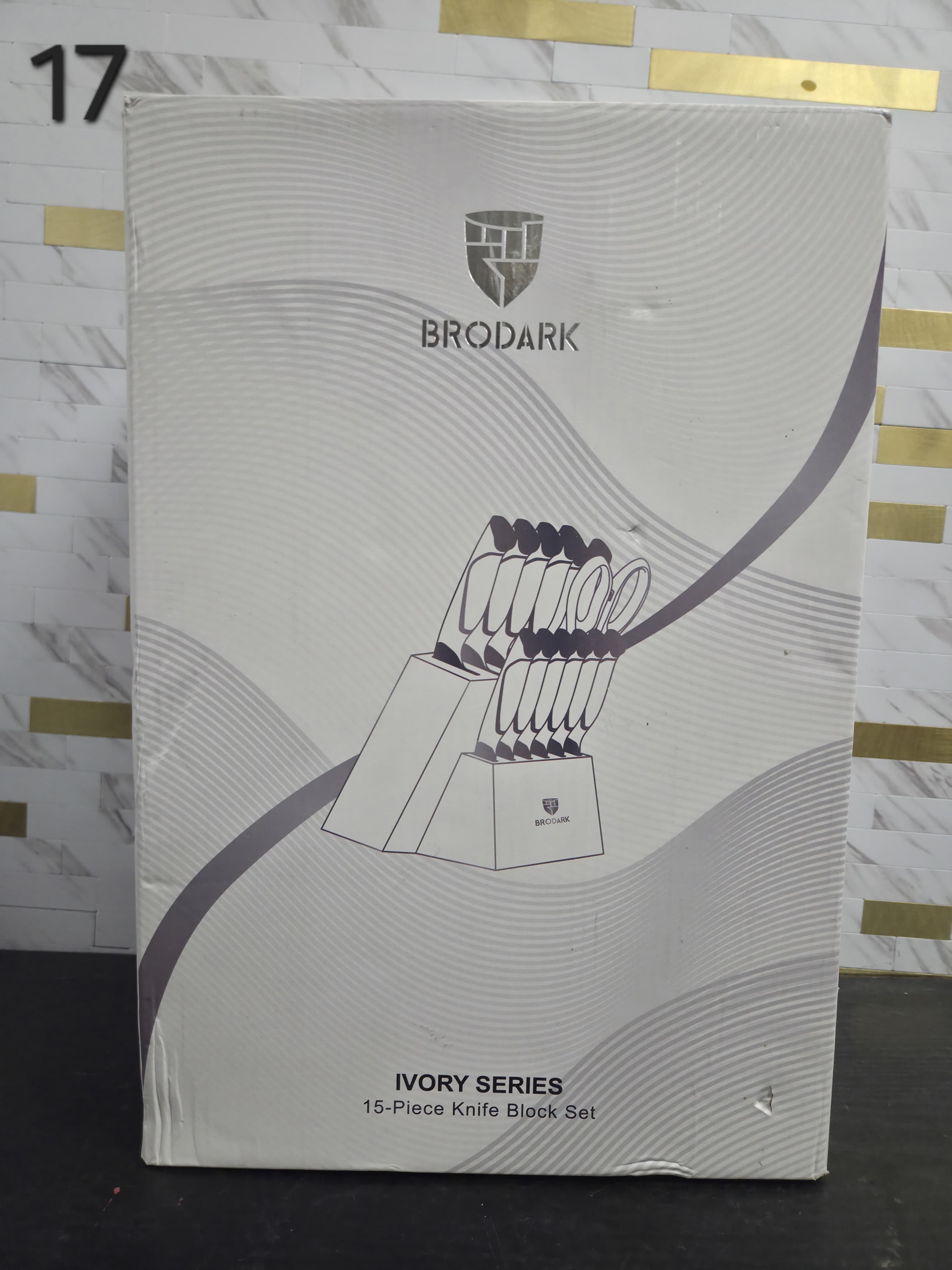 BRODARK Kitchen Knife Sets with Block and Built-in Sharpener - Ultra Sharp15 Pcs Full Tang Professional Chef Knife Set, High Carbon Super Steel Cutlery Set, Ivory Series with Gift Box for Men Women. Lv17