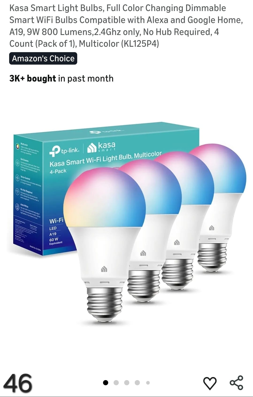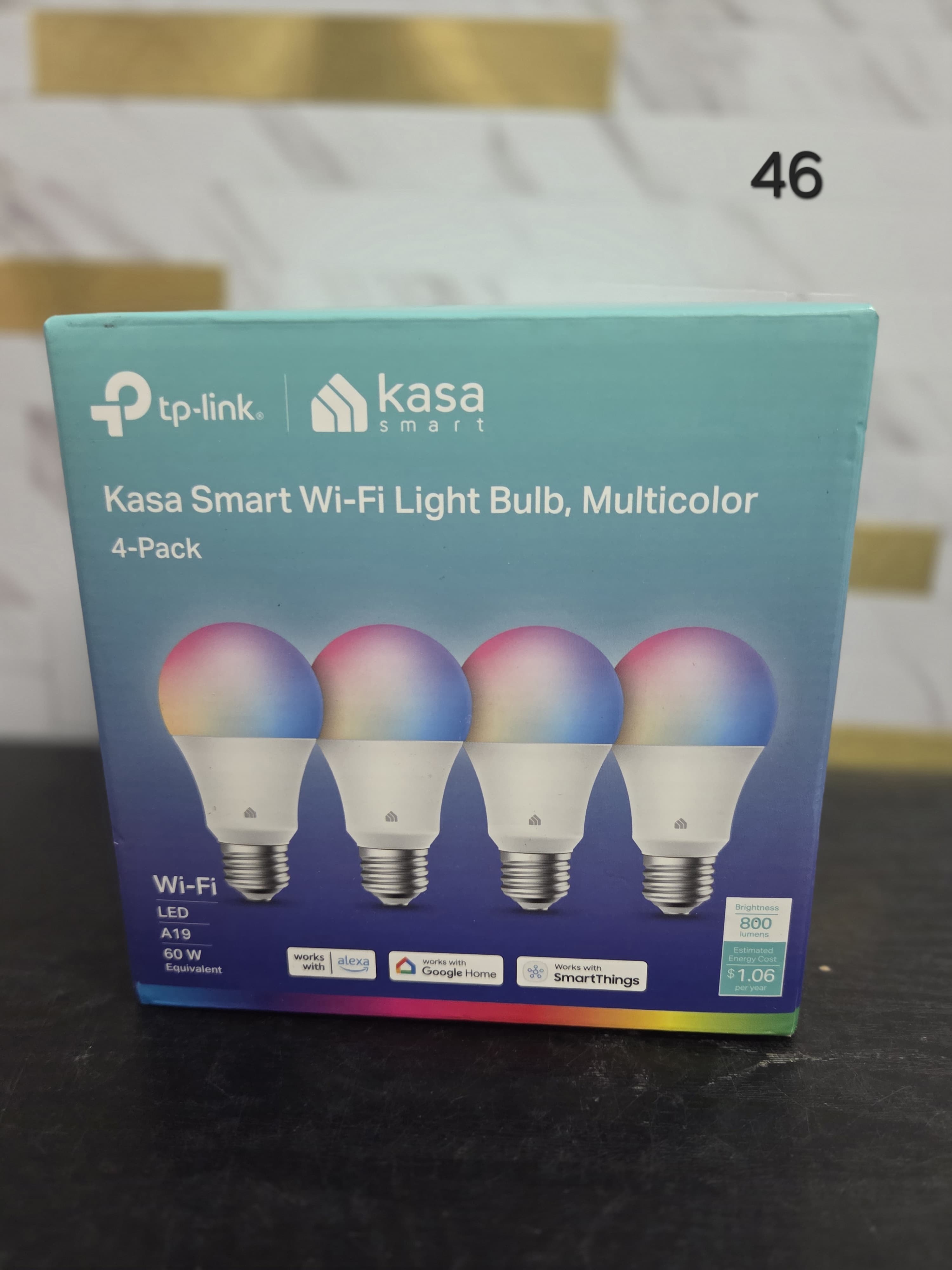Kasa Smart Light Bulbs, Full Color Changing Dimmable Smart WiFi Bulbs Compatible with Alexa and Google Home, A19, 9W 800 Lumens, 2.4Ghz only, No Hub Required, 4 Count (Pack of 1), Multicolor (KL125P4). Lv46